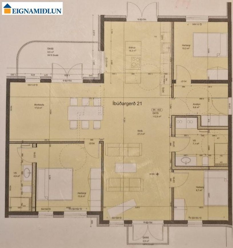 Íbúðin skiptist í þrjú svefnherbergi (möguleiki að bæta við fjórða svefnherberginu), tvö baðherbergi, öðru með þvottaaðsstöðu, alrými með stofu, borðstofu, eldhúsi. Bílastæði og bílskúr í bílakjallara