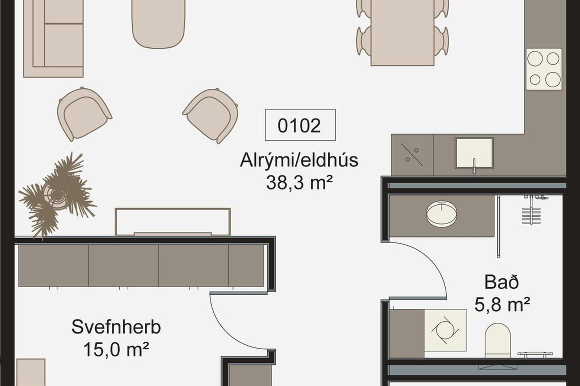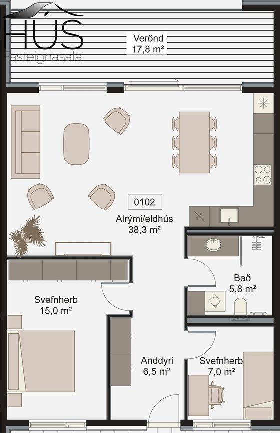 Eldhús og borðstofa: Vönduð innrétting. Innfeld uppþvottavél og ísskápur. Innbyggður blástursofn og spanhelluborð með innbyggðri viftu. Vönduð tæki, Miele og Elica frá Eirvík. Borðplata úr steini. Úr borðstofu er útgengi um rennihurð út á verönd.