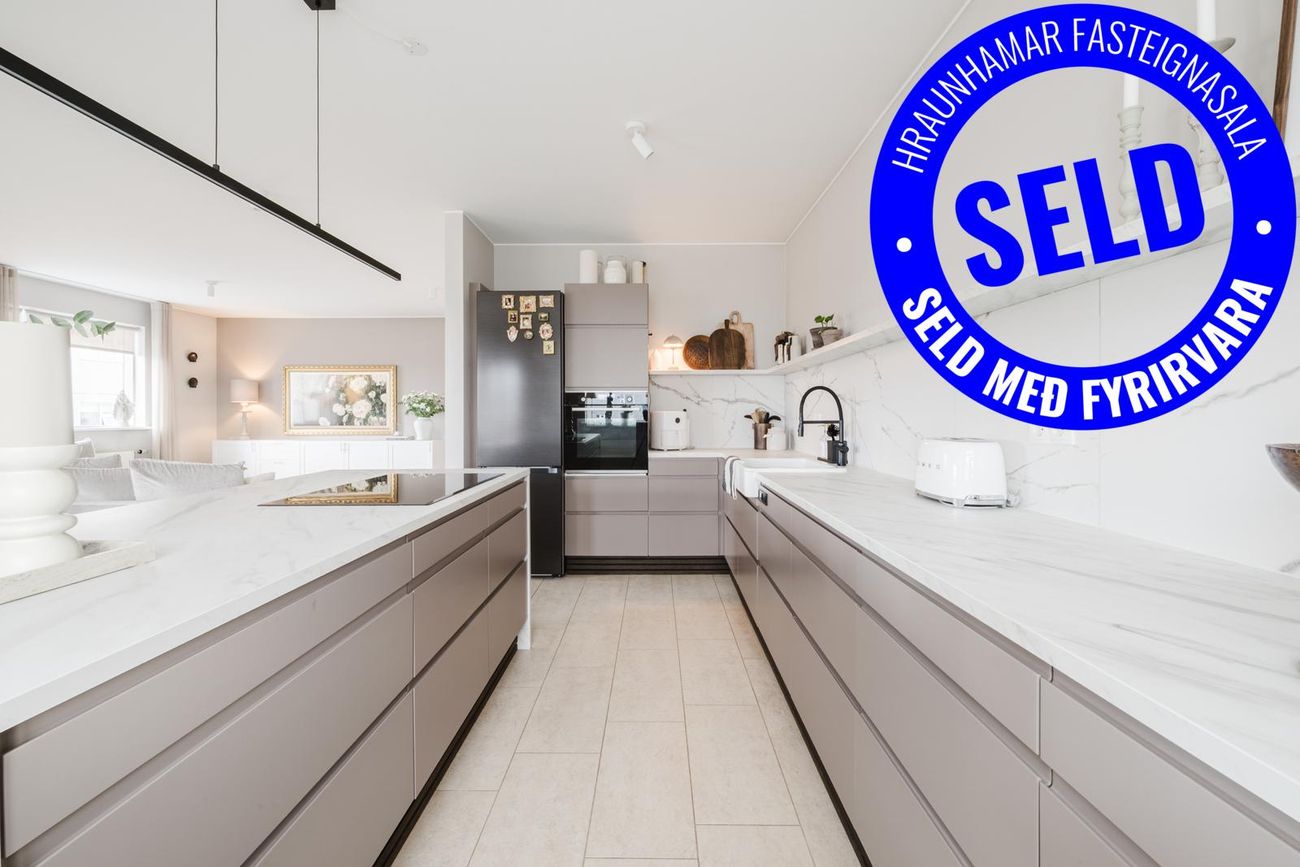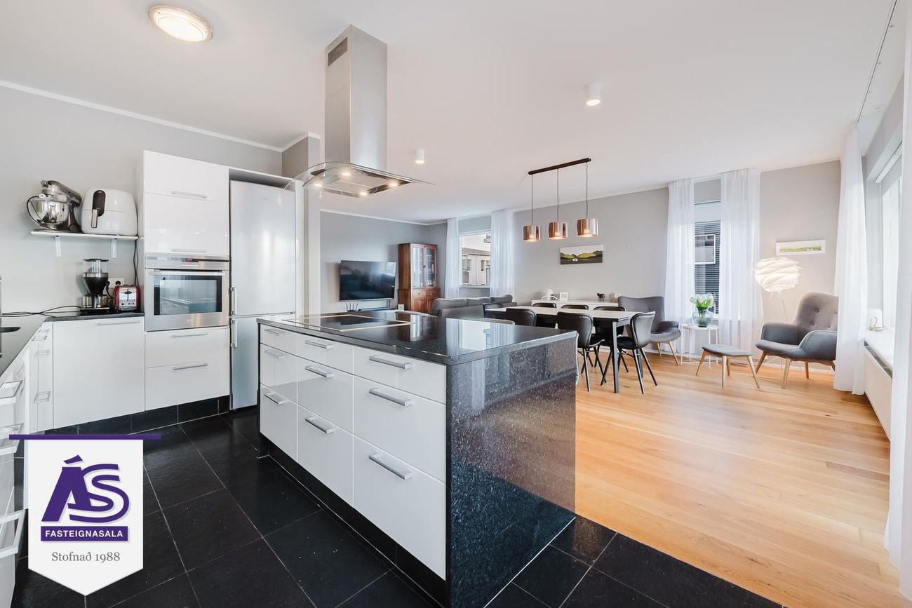 Fallegar innréttingar, svartur steinn á bekkjum í eldhúsi og á eldunareyju, vönduð eign sem er alls 158 fm og allir fm innan eignar.