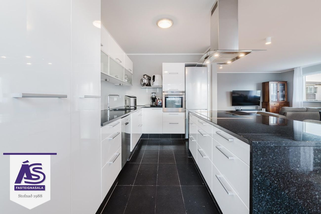 Fallegar innréttingar, svartur steinn á bekkjum í eldhúsi og á eldunareyju, vönduð eign sem er alls 158 fm og allir fm innan eignar.