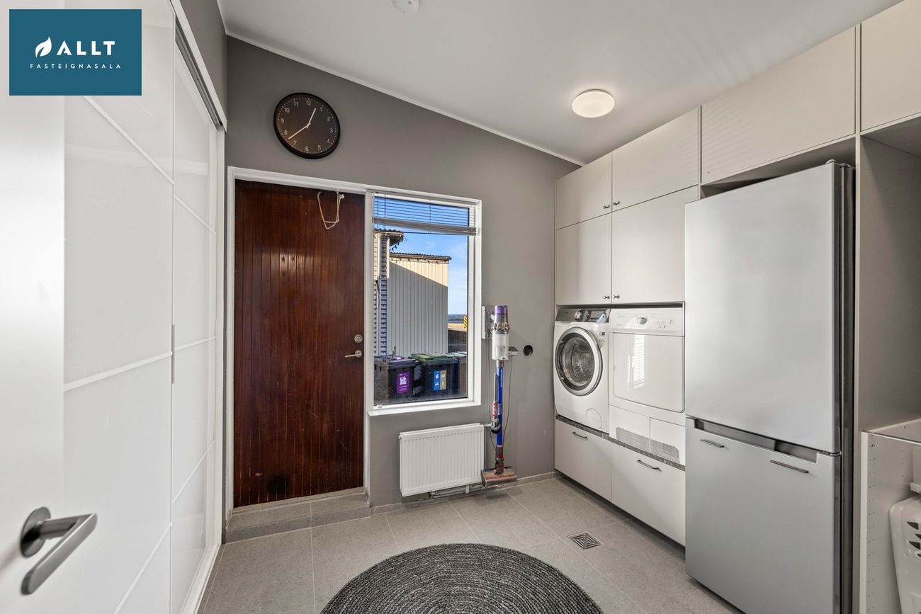 Endurnýjað þvottahús með flísalögðu gólfi, nýrri innréttingu og útgöngu í garð.