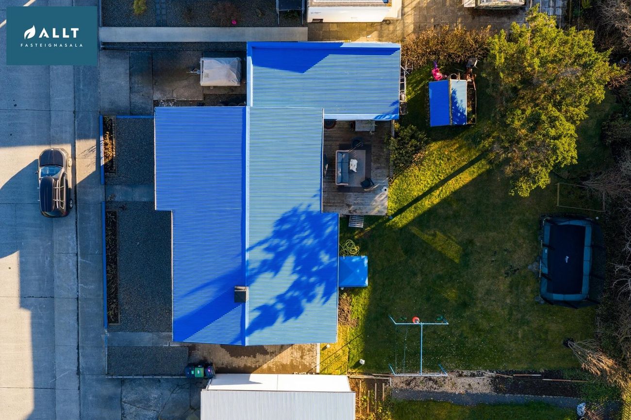 Bílskúr með verönd í vestur og nýlegri hurðaropnara.