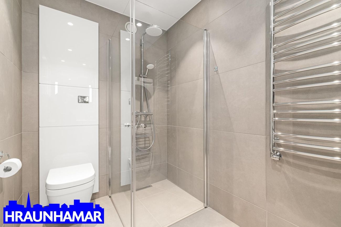 baðherbergi með fínni sturtuaðstöðu, flísar í hólf og gólf, vönduð innrétting, flísar, handklæðaofn, tengt fyrir þvottavél/þurkkara. Vandað