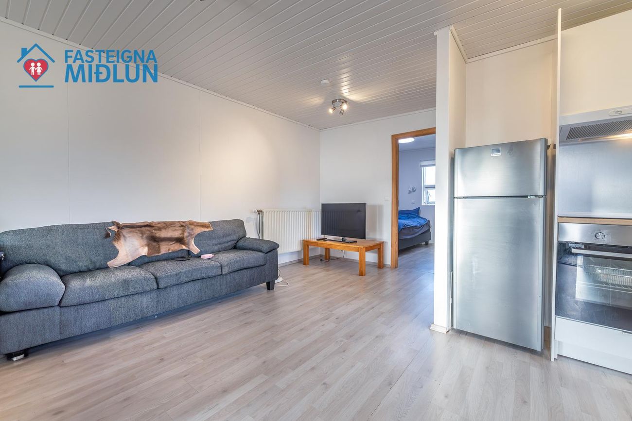 Aukaíbúð í bílskúr með opnu alrými, eldhúsi, stofu, baðherbergi og svefnherbergi.