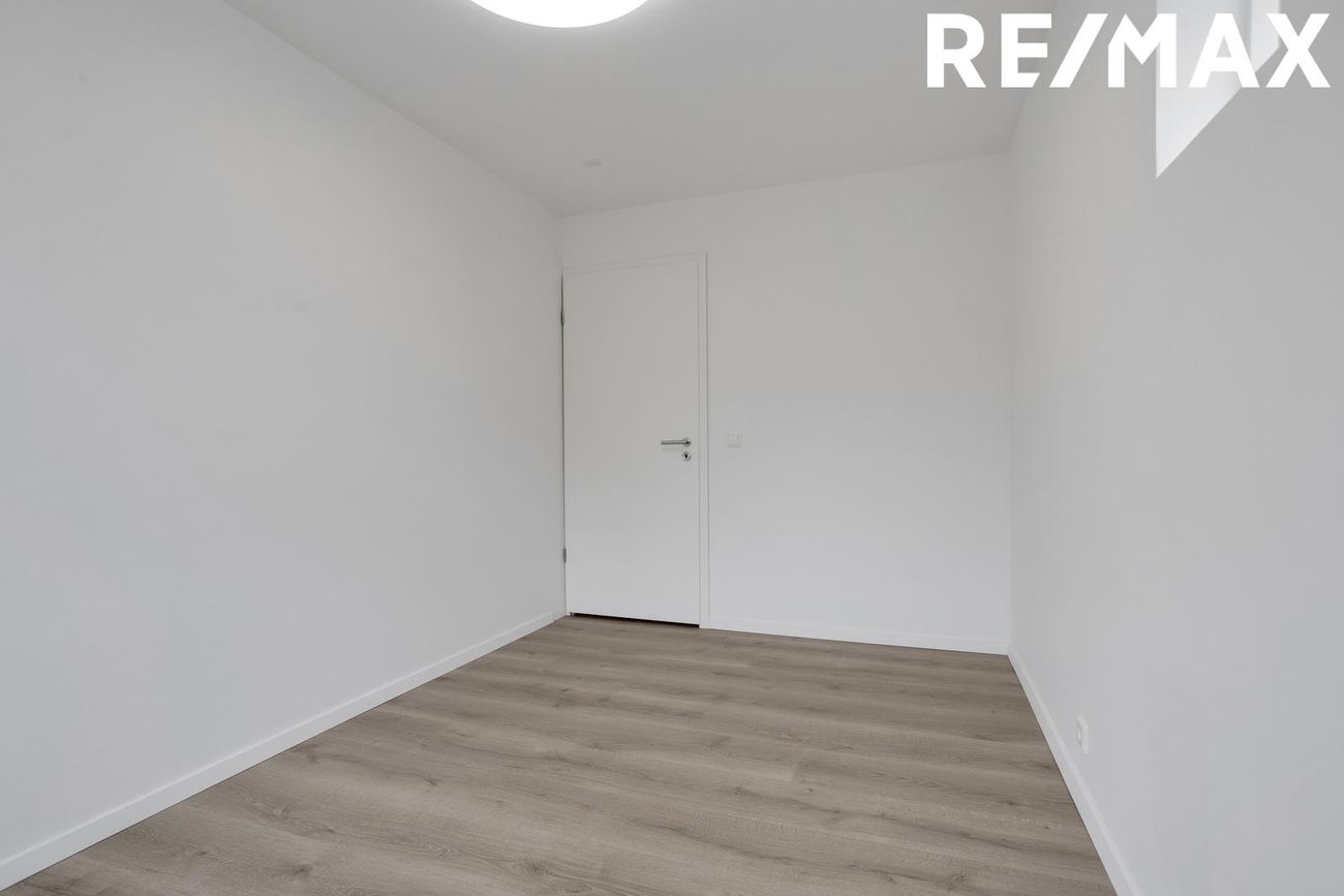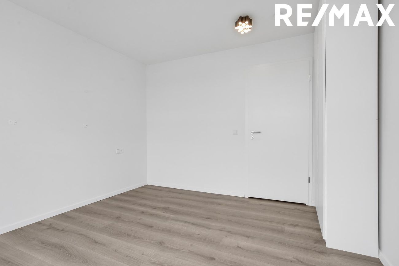 Svefnherbergi: Parketlagt með rúmgóðum skápum.