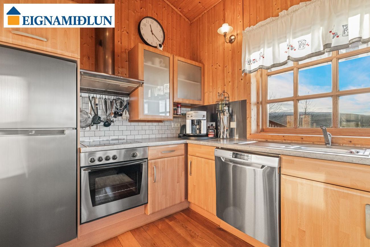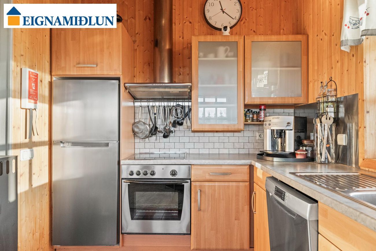 Eldhús er með góðri innréttingu með ofn, uppþvottavél og ísskáp.