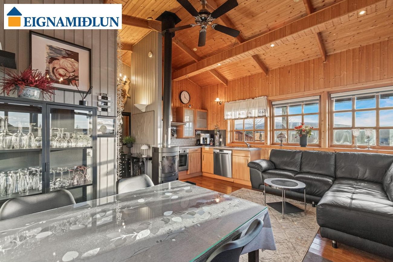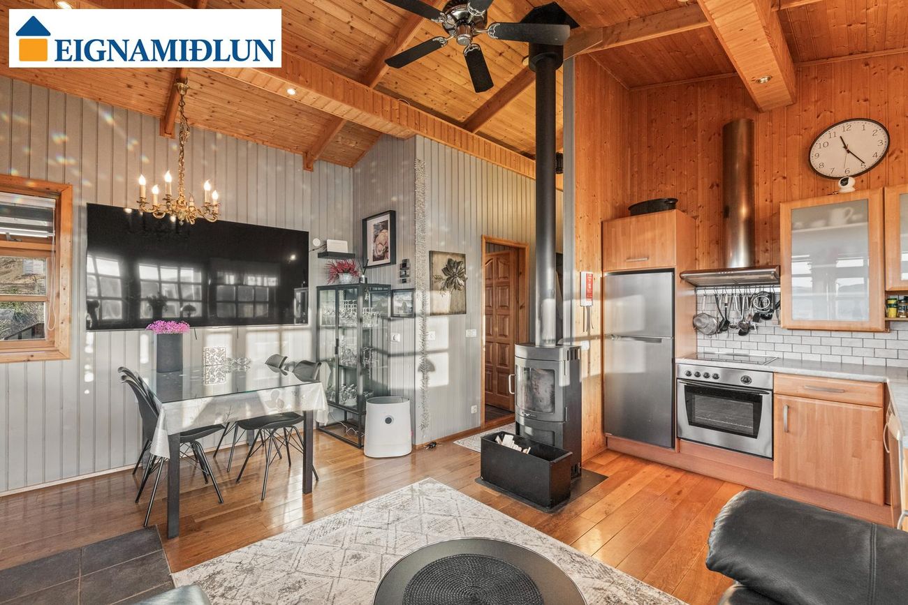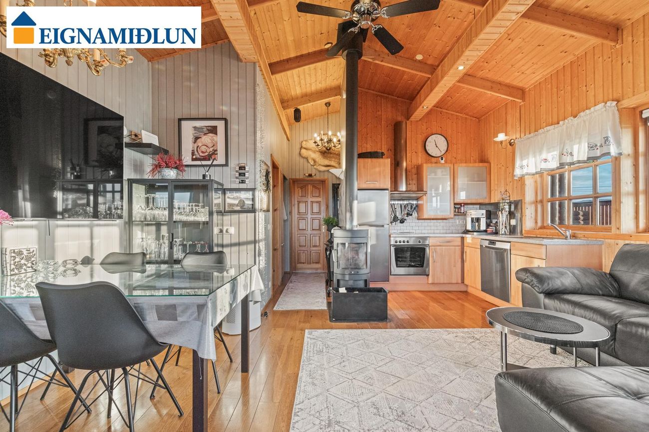 Stofa er parketlögð með fallegri kamínu. Útgengi frá stofu útá pall og stórir gluggar með góðu útsýni.