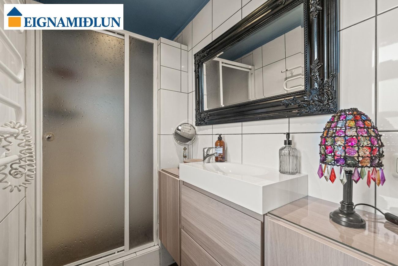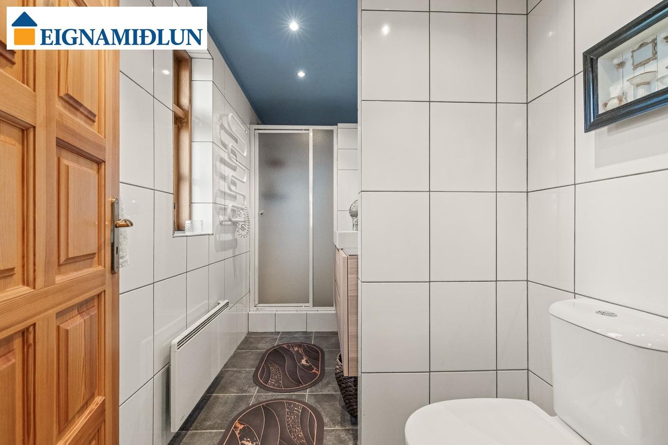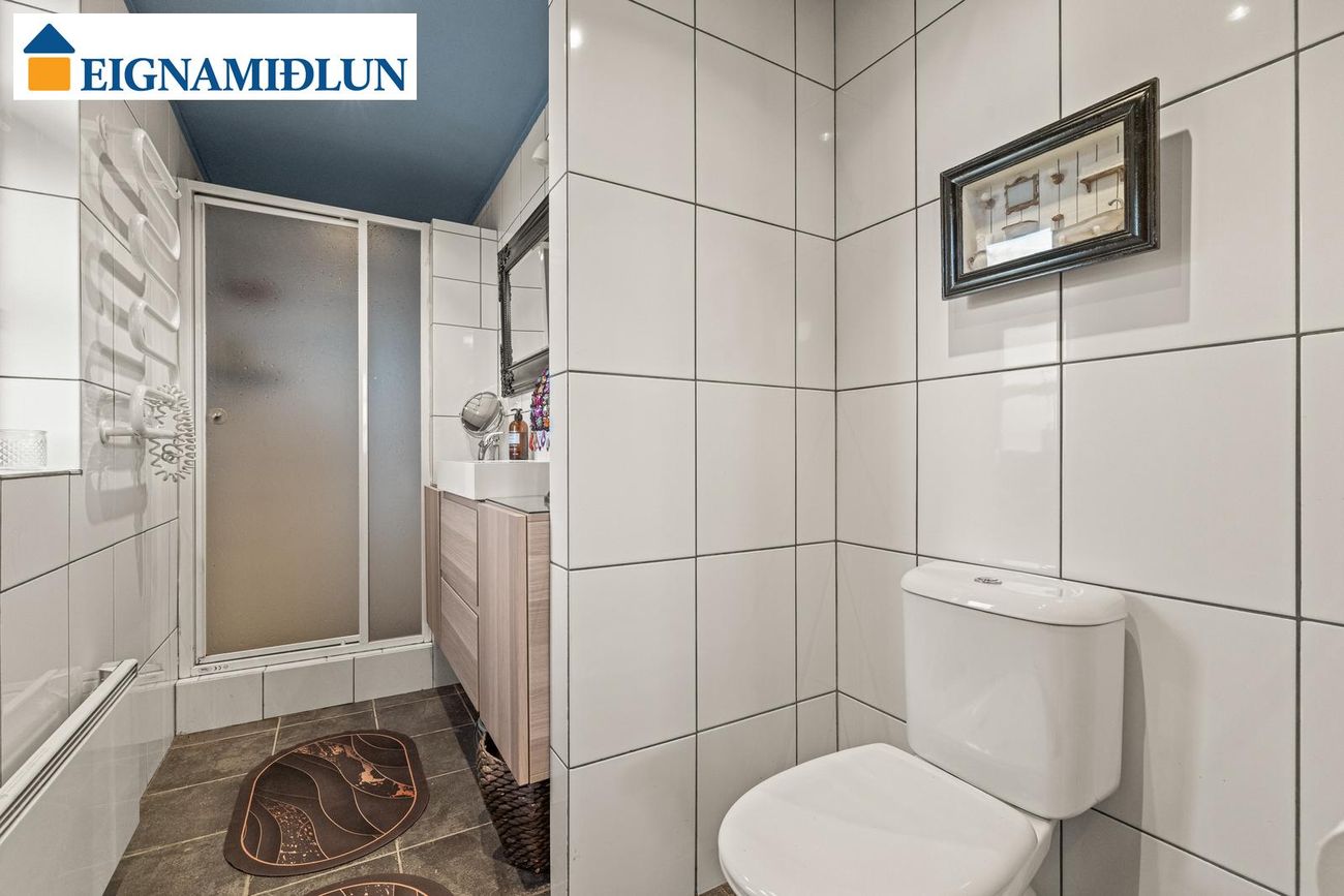 Baðherbergi er innaf anddyri og er flísalagt með klósett, handklæðaofni, sturtuklefa og vaskainnréttingu.