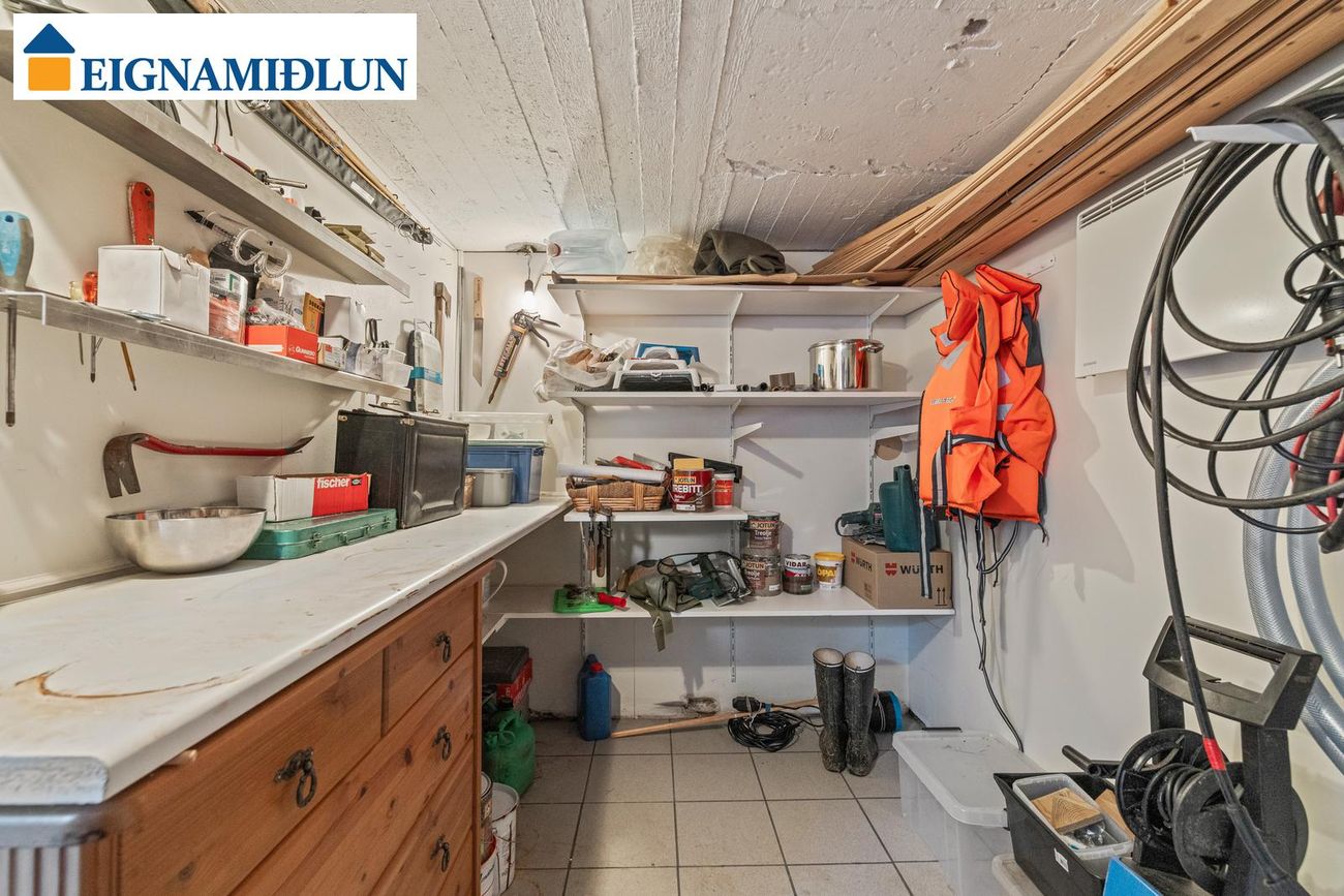 Í kjallara er anddyri, geymsla og eitt svefnherbergi. Anddyrið og geymsla eru flísalögð og svefnherbergið er með nýlegu parketi.