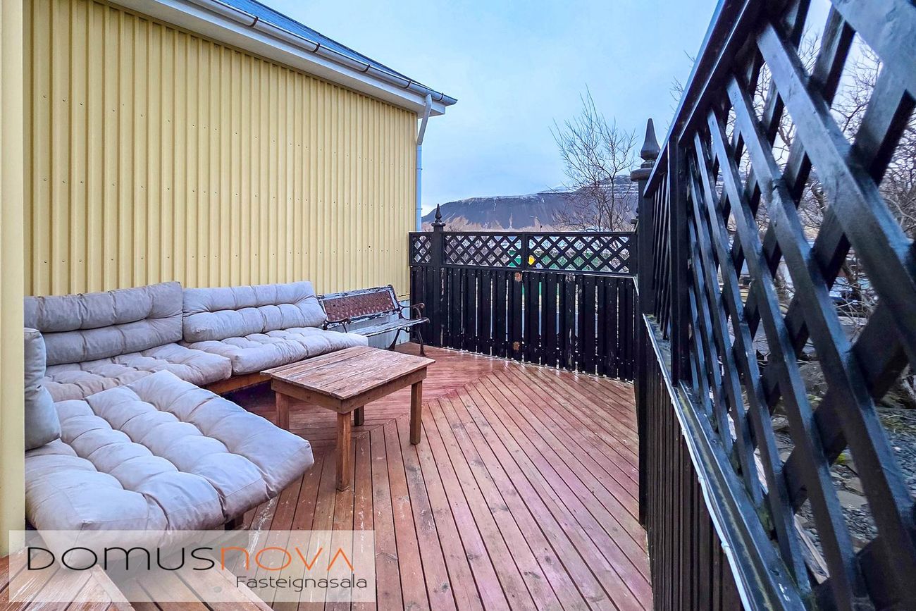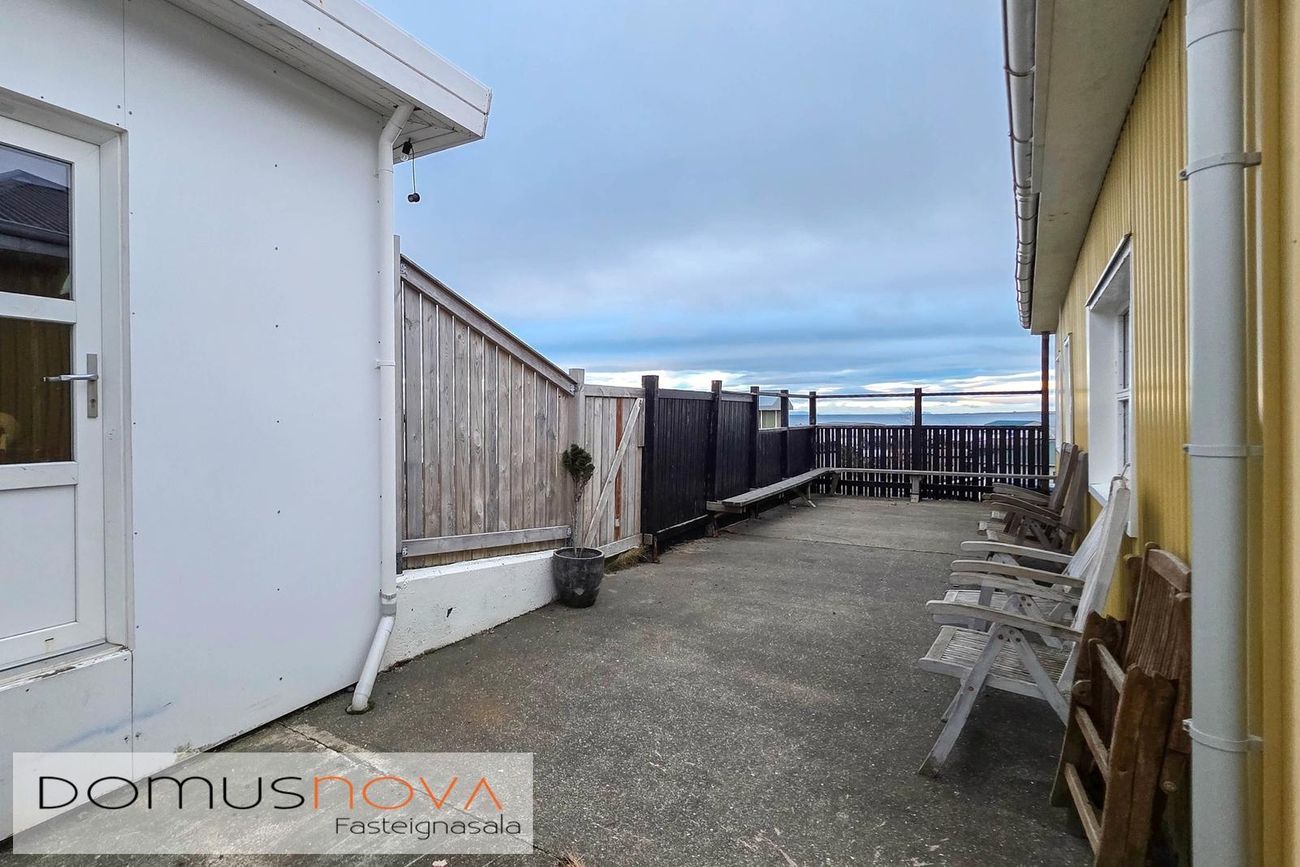 Hrannar Jónsson, löggiltur fasteignasali / s. 899 0720 / hrannar@domusnova.isSjöfn Hilmarsdóttir, lgf. // s. 691-4591 // sjofn@domusnova.isEyrarvegur 20 er 168,1 fm steinsteypt einbýlishús á tveimur hæðum, þar af 130,3 fm íbúðarrými og 38,5 fm stakstæður bílskúr. Húsið er klætt bárujárni að utan. Innra skipulagi eignarinnar hefur verið breytt frá upphaflegri teikningu, árið 1996 var húsið stækkað með viðbyggingu og settur nýr stigi milli hæða. Aðalinngangur sem áður var um útitröppur á efri hæð var færður og er nú á neðri hæð. Íbúðarrými eignar er 130,3 fm., á neðri hæð er forstofa, gangur, herbergi, hol og þvottahús. Á efri hæðinni er gangur, tvö herbergi, baðherbergi, eldhús og stofa þaðan sem útgengt er á timburverönd í gróin og snyrtilegan bakgarð. Stigi milli hæða er í forstofu.
