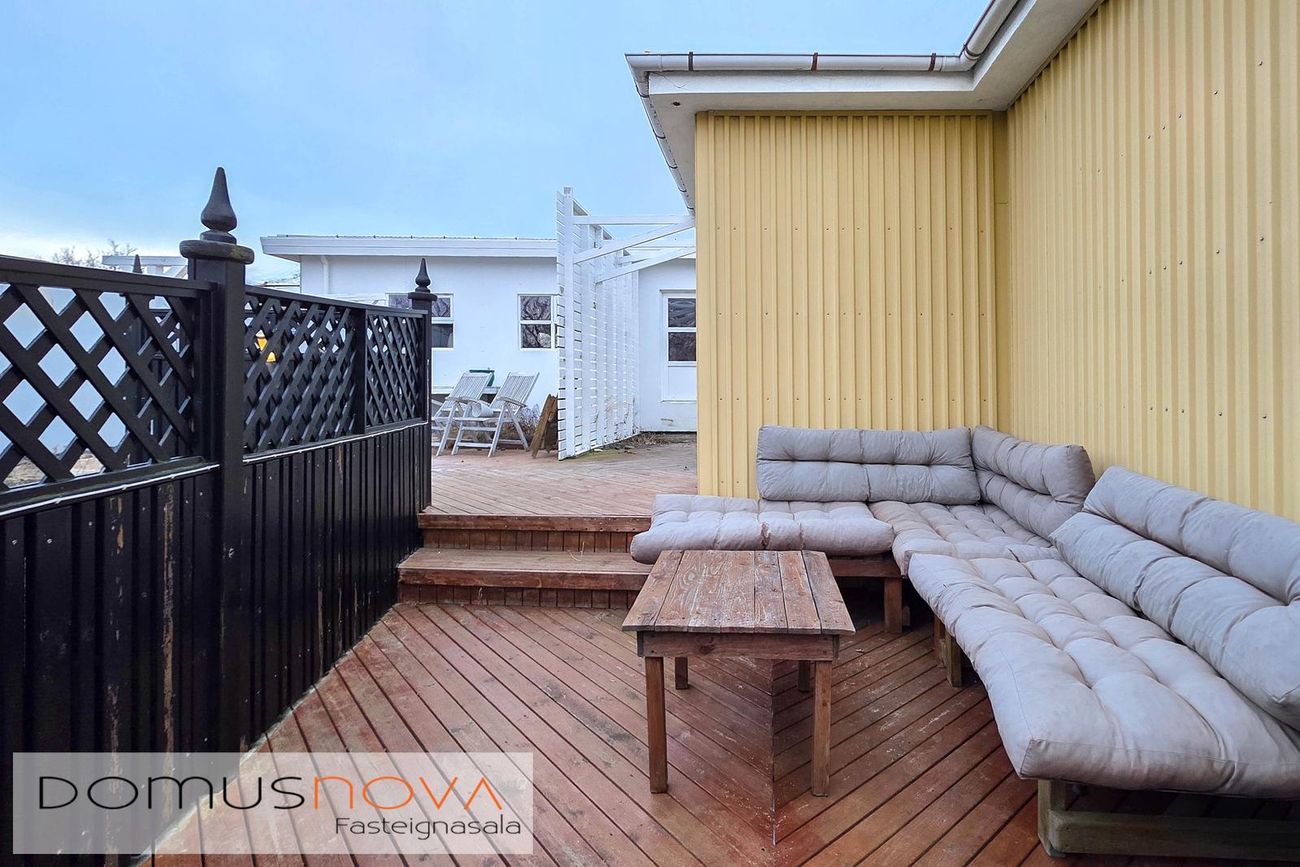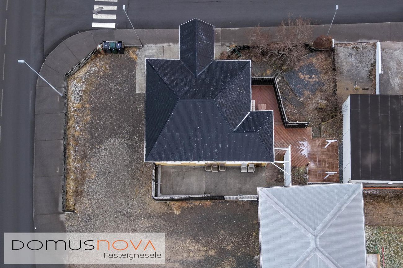 Lóð og garður: Lóðin er 594,0 fm. með góðri aðkomu og nægum bílastæðum. Bakgarður er afar skjólsamur, með timburverönd, skjólveggjum og steyptri stétt milli bílskúrs og húss, runnar og plöntur ásamt lýsingu í garði.
