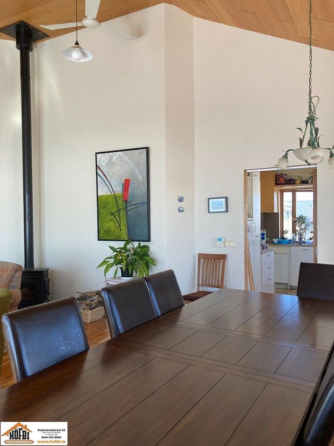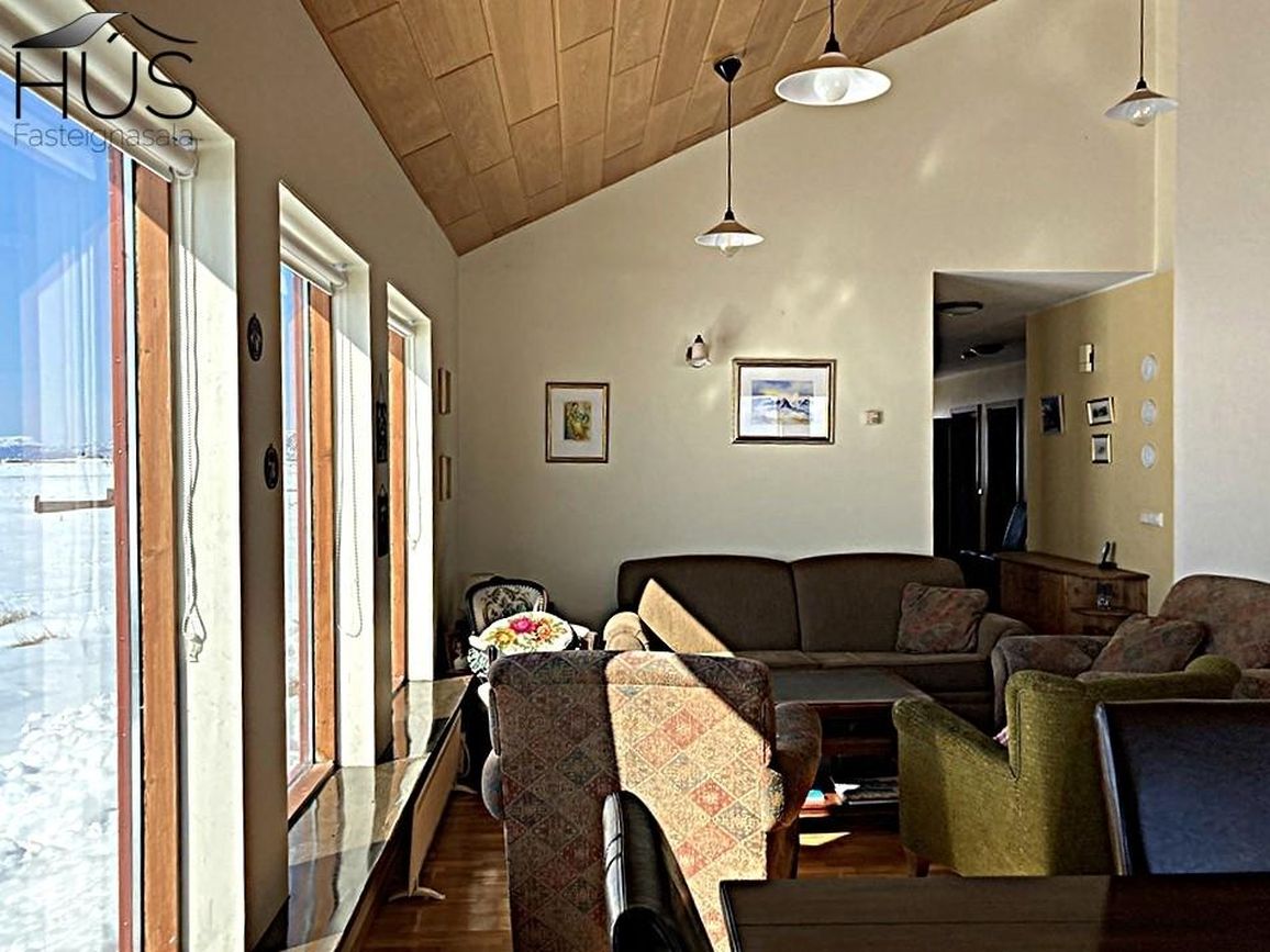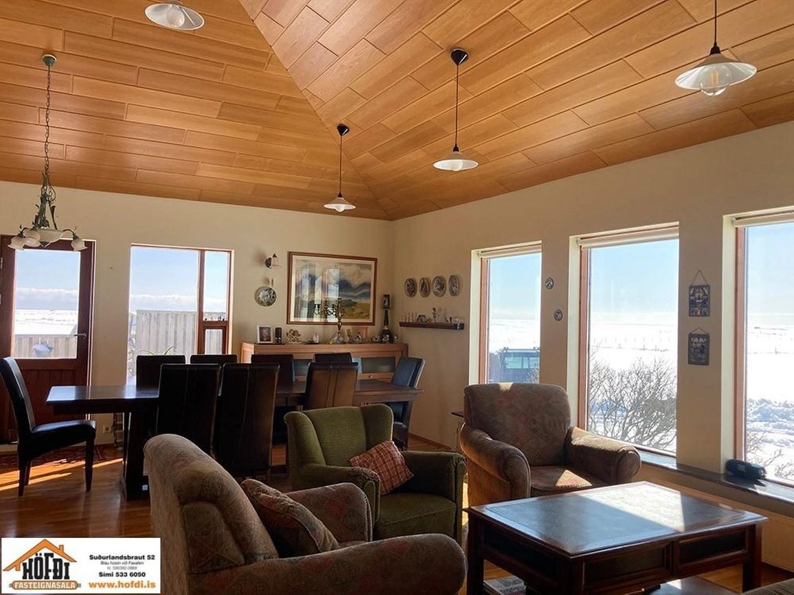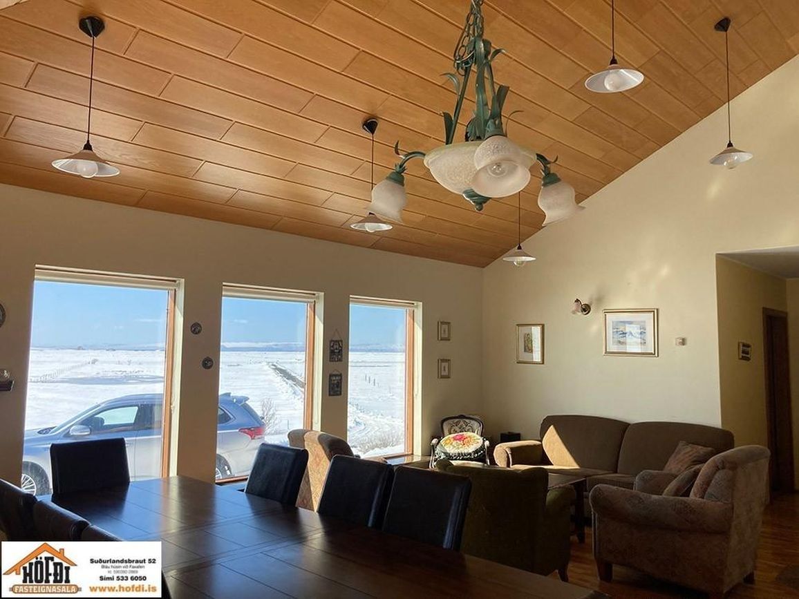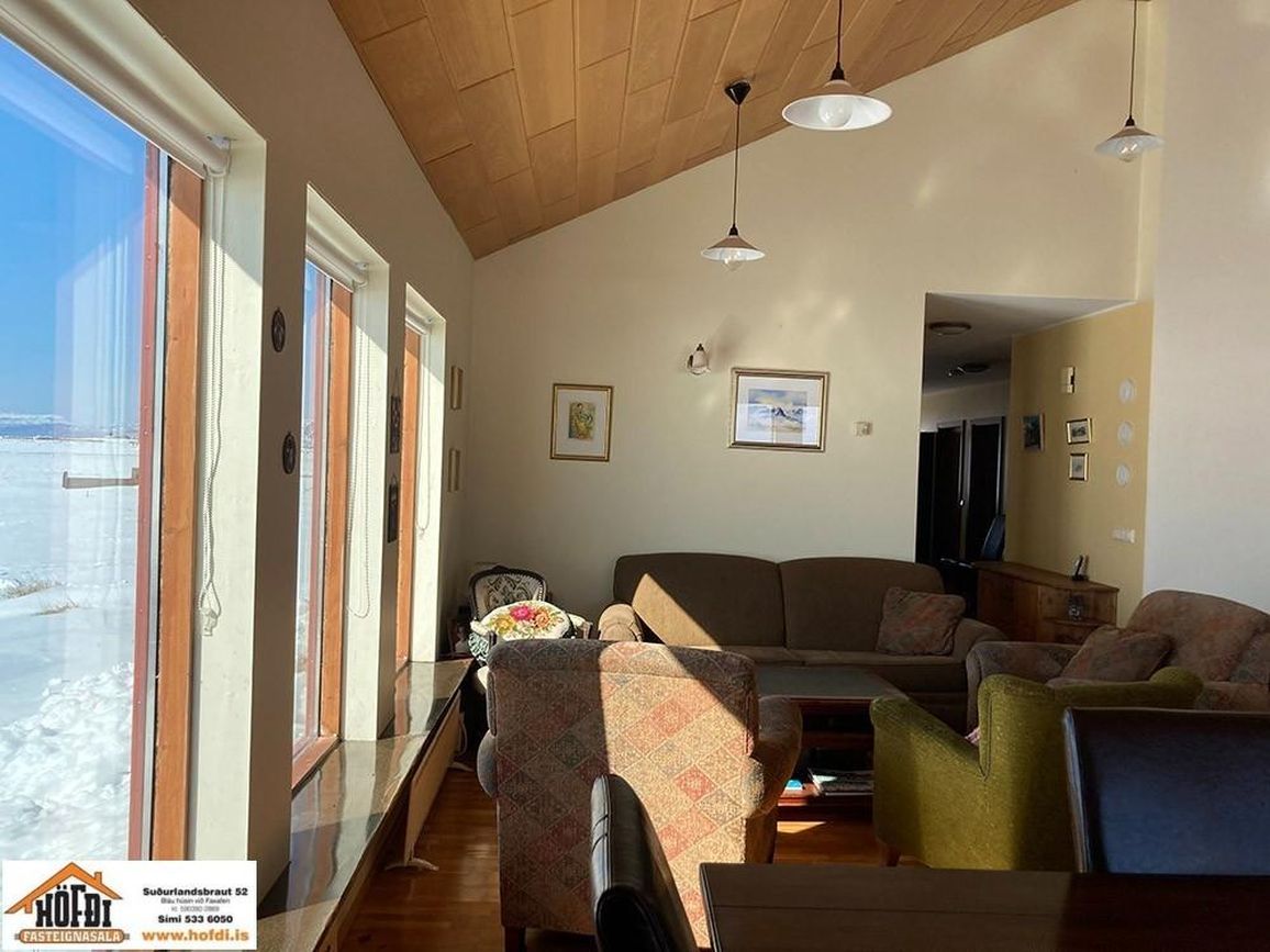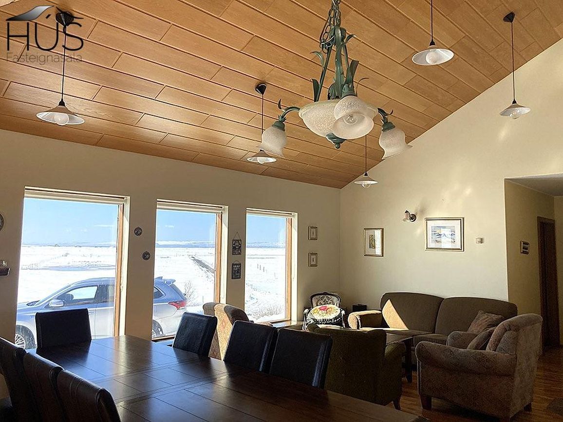 Hér er víðsýnt og stutt í alla helstu þjónustu. Íbúðarhúsið er timburhús byggt 1995 á einni hæð með skriðkjallara undir. Fallegt útsýni er úr húsinu og upptekin loft í stofum, kamína. Við hliðina eru gömul útihús sem ekki eru skráð en hægt væri að gera þau upp og nýta með margvíslegum hætti. Í íbúðarhúsinu eru m.a. fjögur herbergi, baðherbergi, snyrting, þvottahús, eldhús, stofur og sjónvarpsherbergi.
