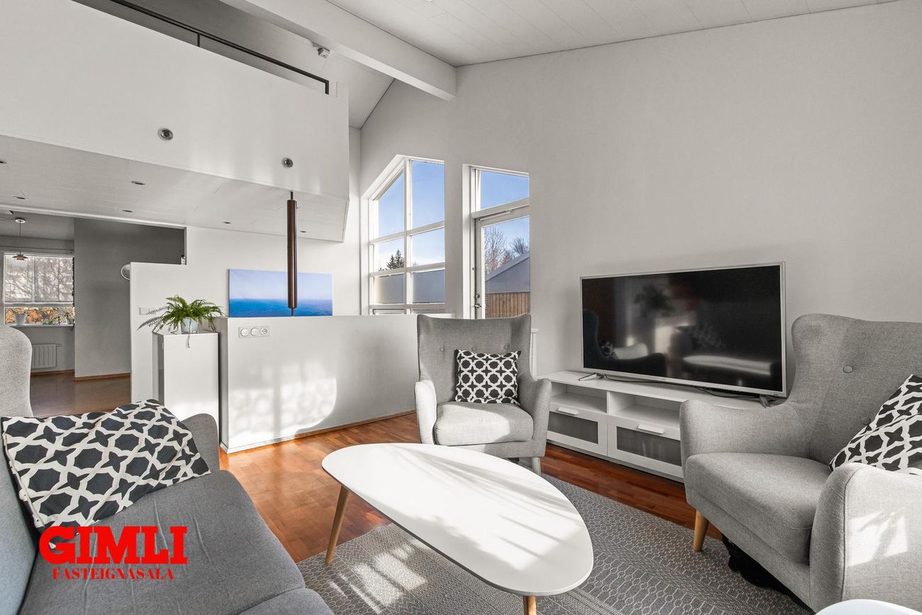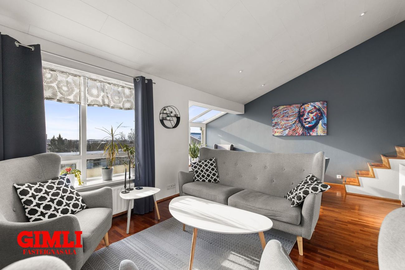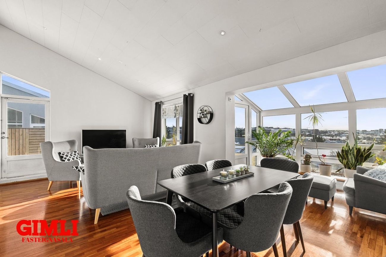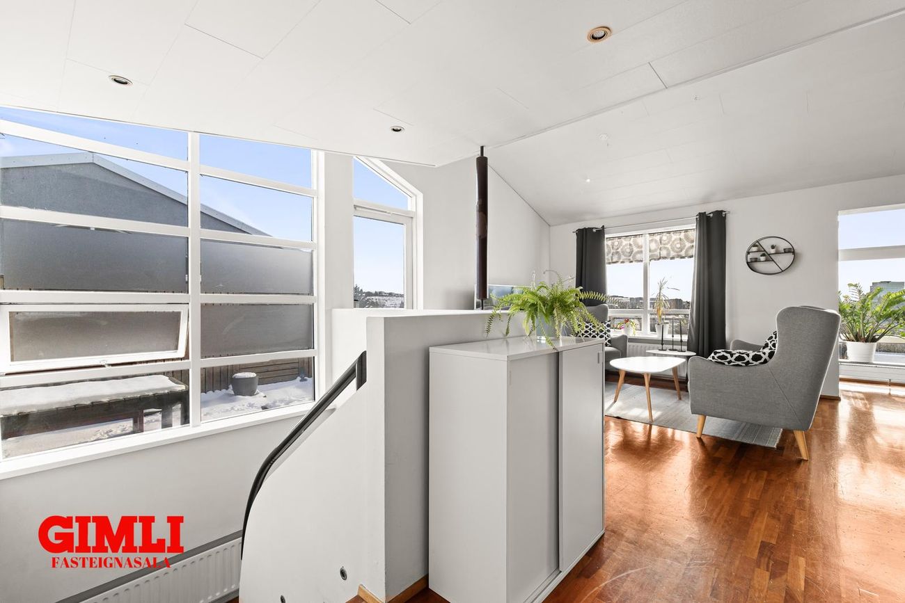 Efri hæð:Stofa og borðstofa mynda fallegt og bjart rými. Sólskálinn í suðurenda stofunnar er nýlega endurnýjaður og úr honum er gengt út á suðursvalir. Úr stofu er gengt út á skjólsæla afgirta verönd sem er ofaná bílskúrnum. Úr stofu er parketlagður stigi upp á ca 11 fm risloft, með opnanlegum þakglugga, sem notað er sem setustofa í dag. Risloftið er ekki inn í fermetratölu hússins. Á efri hæðinni er gestasalerni og einnig þvottaherbergi. Innst á hæðinni er stórt eldhús með U-laga eldhúsinnéttingu og síðan er stór eldhúskrókur við hlið eldhússins. Parket er á gólfum stofu og borðstofu en dúkur á eldhús gólfi.