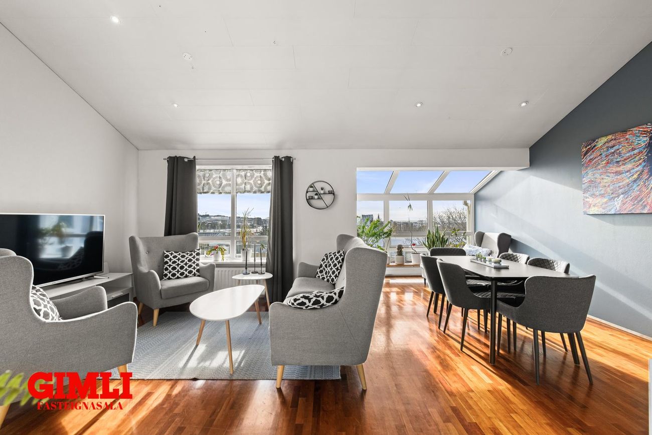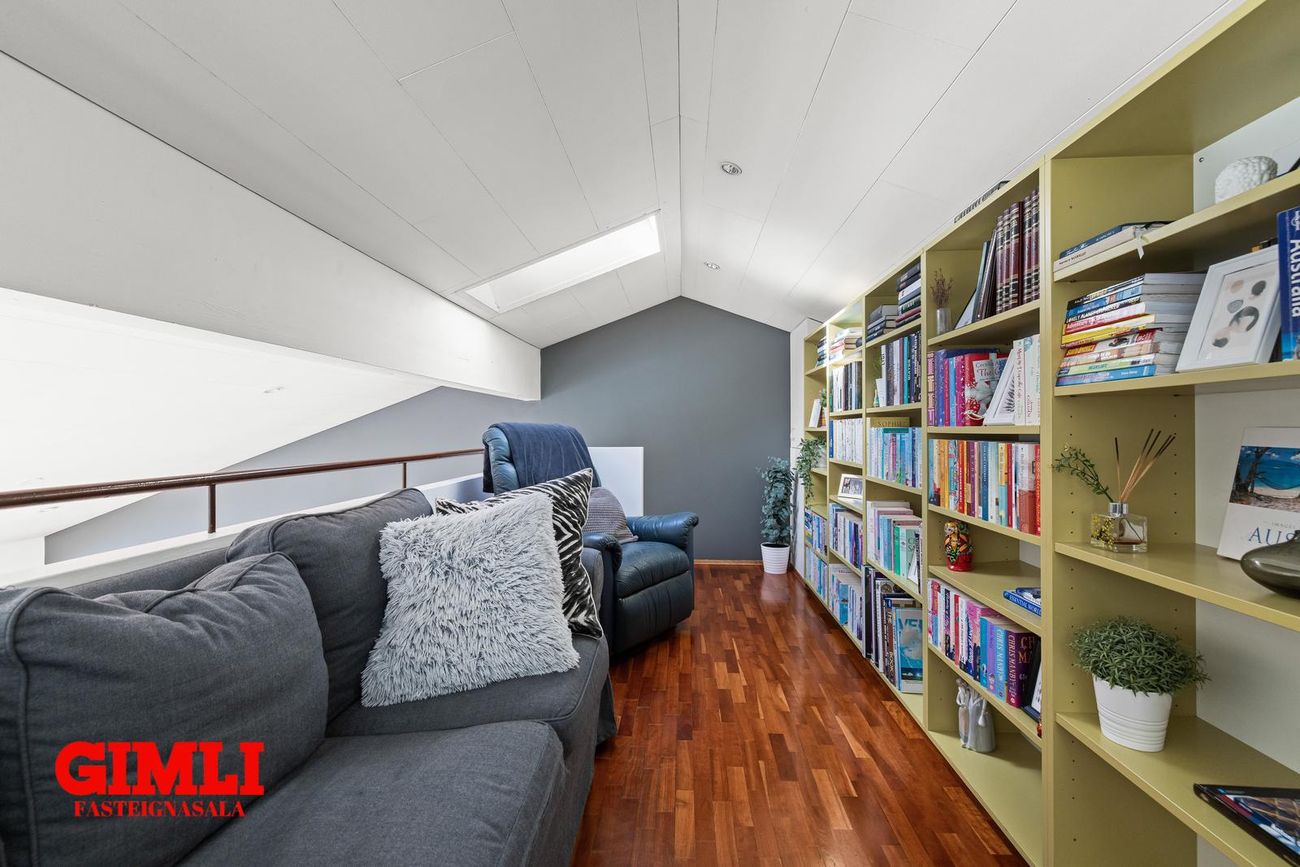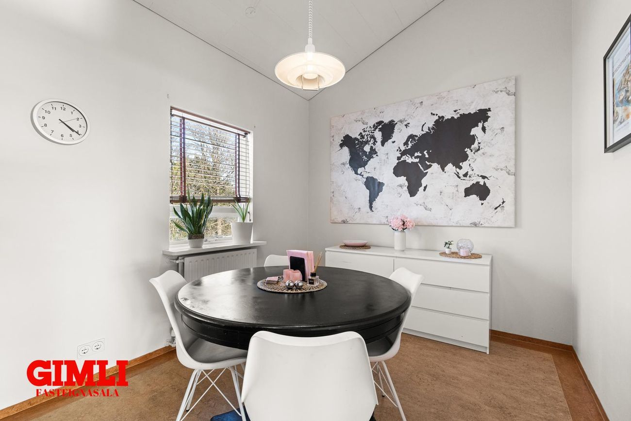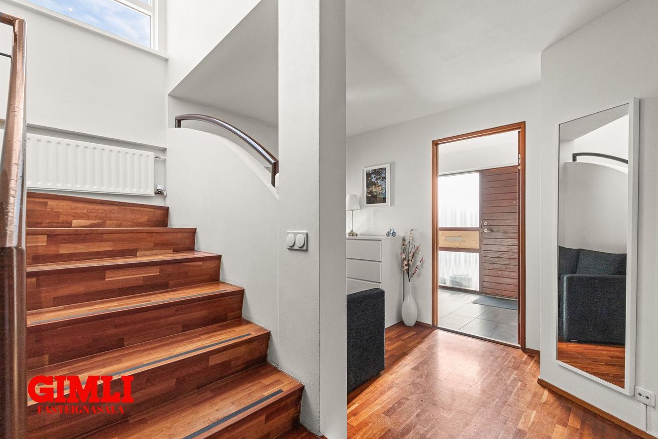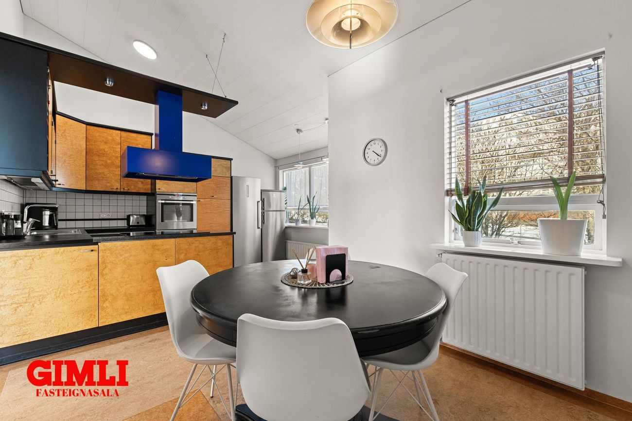 Efri hæð:Stofa og borðstofa mynda fallegt og bjart rými. Sólskálinn í suðurenda stofunnar er nýlega endurnýjaður og úr honum er gengt út á suðursvalir. Úr stofu er gengt út á skjólsæla afgirta verönd sem er ofaná bílskúrnum. Úr stofu er parketlagður stigi upp á ca 11 fm risloft, með opnanlegum þakglugga, sem notað er sem setustofa í dag. Risloftið er ekki inn í fermetratölu hússins. Á efri hæðinni er gestasalerni og einnig þvottaherbergi. Innst á hæðinni er stórt eldhús með U-laga eldhúsinnéttingu og síðan er stór eldhúskrókur við hlið eldhússins. Parket er á gólfum stofu og borðstofu en dúkur á eldhús gólfi.