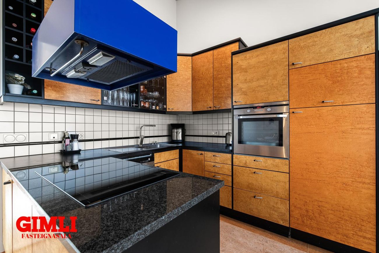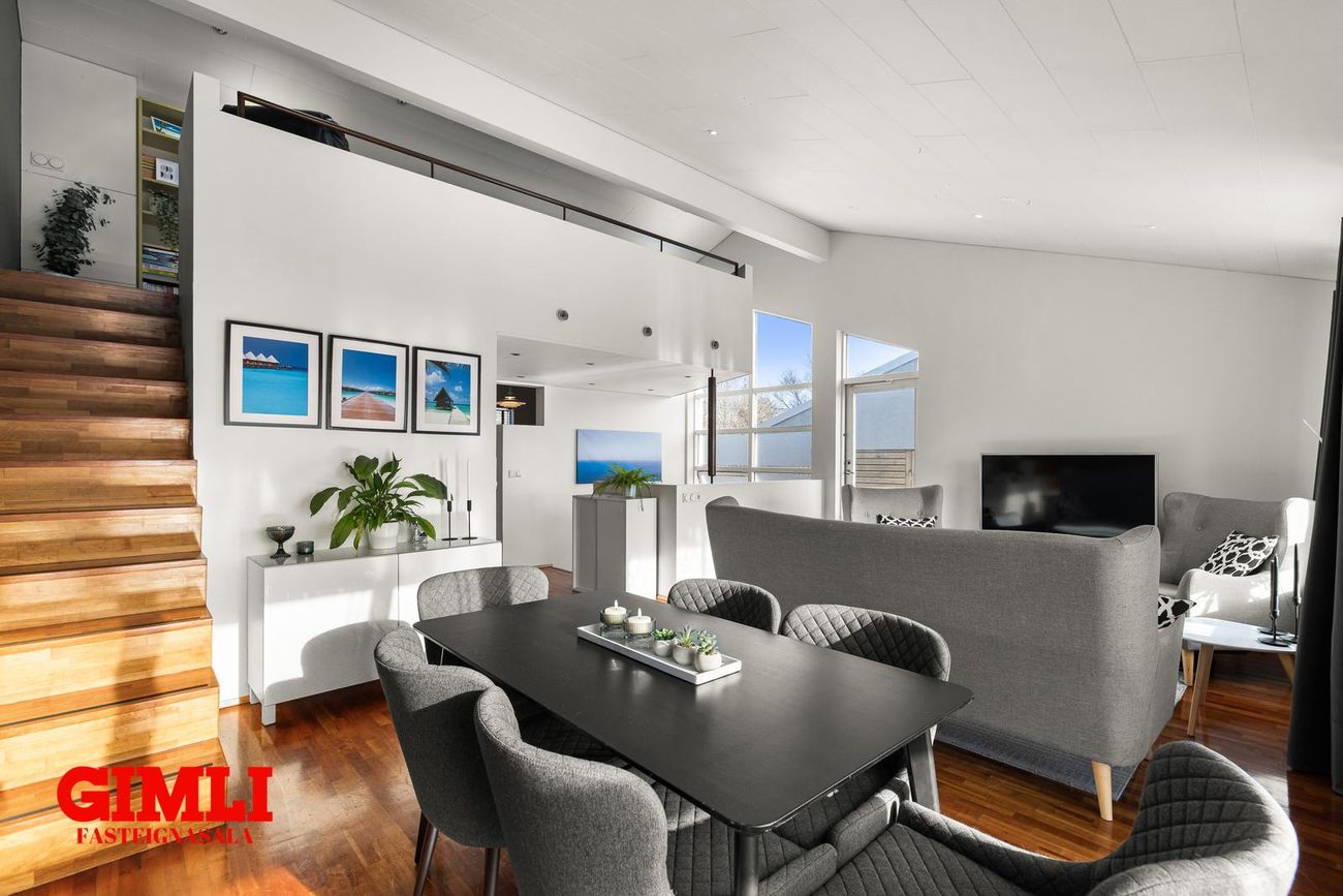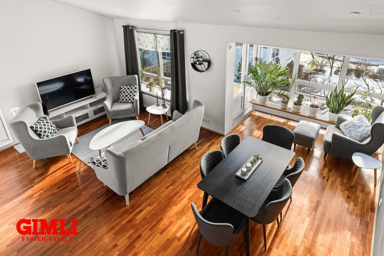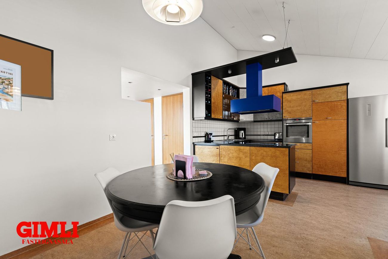 Efri hæð:Stofa og borðstofa mynda fallegt og bjart rými. Sólskálinn í suðurenda stofunnar er nýlega endurnýjaður og úr honum er gengt út á suðursvalir. Úr stofu er gengt út á skjólsæla afgirta verönd sem er ofaná bílskúrnum. Úr stofu er parketlagður stigi upp á ca 11 fm risloft, með opnanlegum þakglugga, sem notað er sem setustofa í dag. Risloftið er ekki inn í fermetratölu hússins. Á efri hæðinni er gestasalerni og einnig þvottaherbergi. Innst á hæðinni er stórt eldhús með U-laga eldhúsinnéttingu og síðan er stór eldhúskrókur við hlið eldhússins. Parket er á gólfum stofu og borðstofu en dúkur á eldhús gólfi.