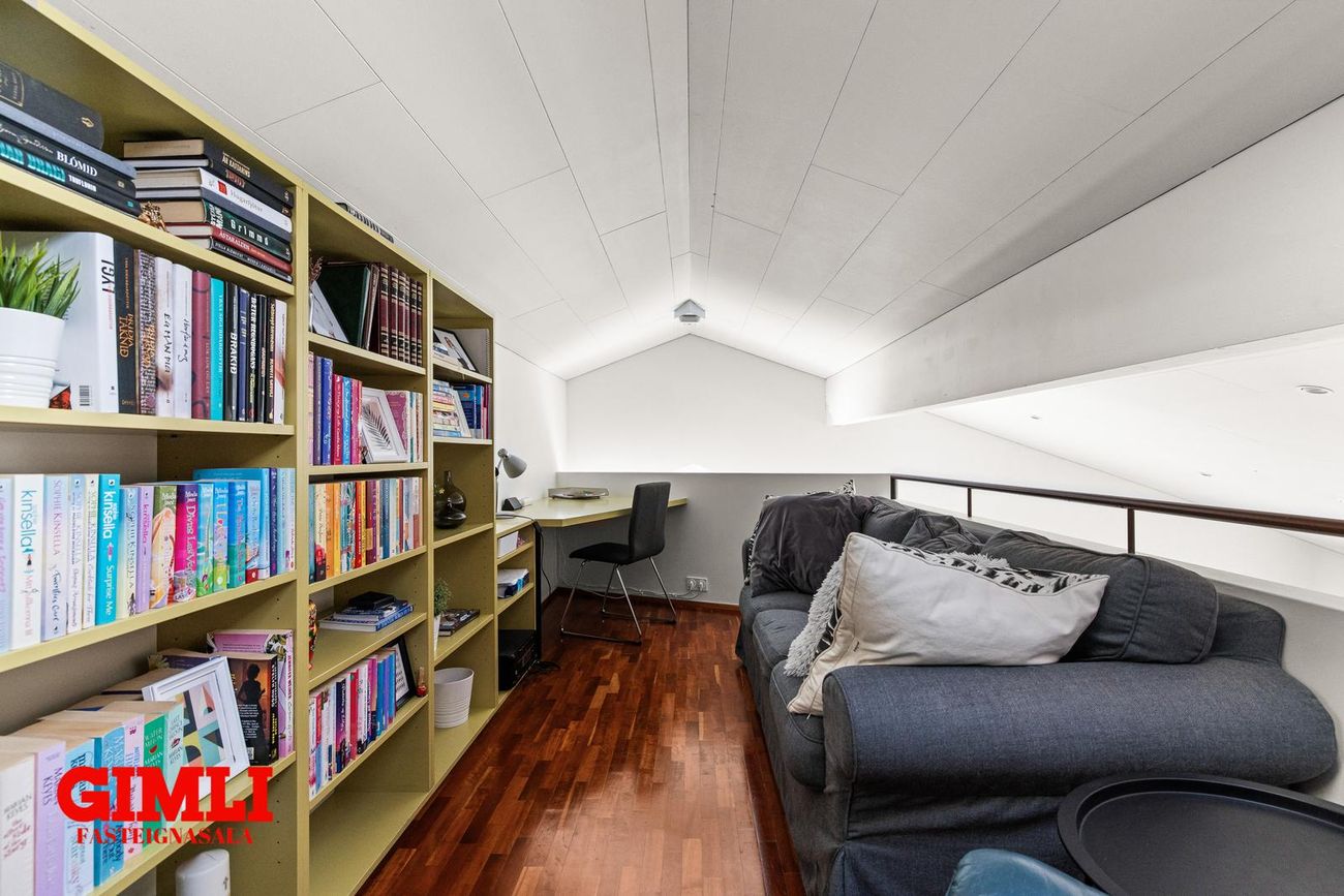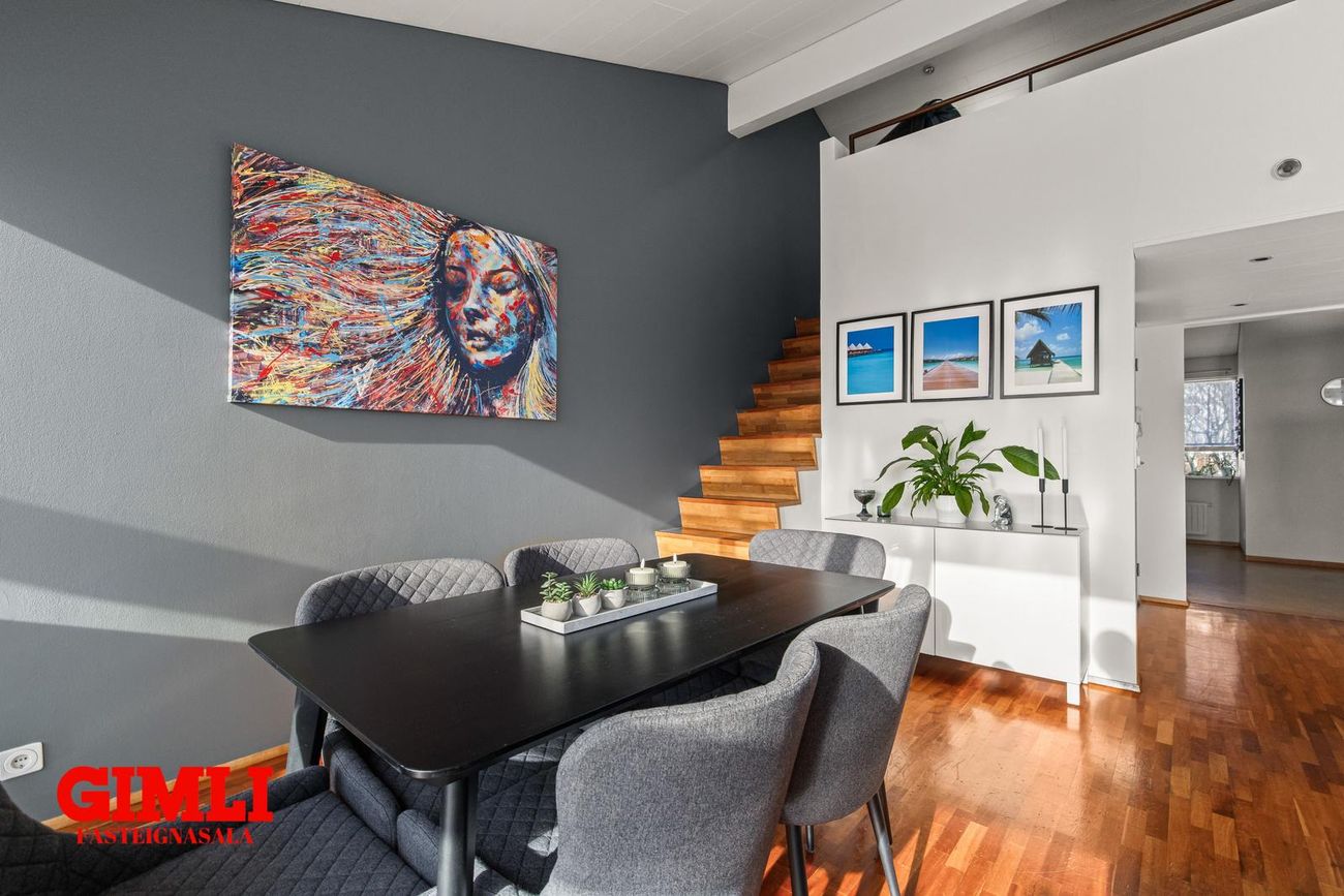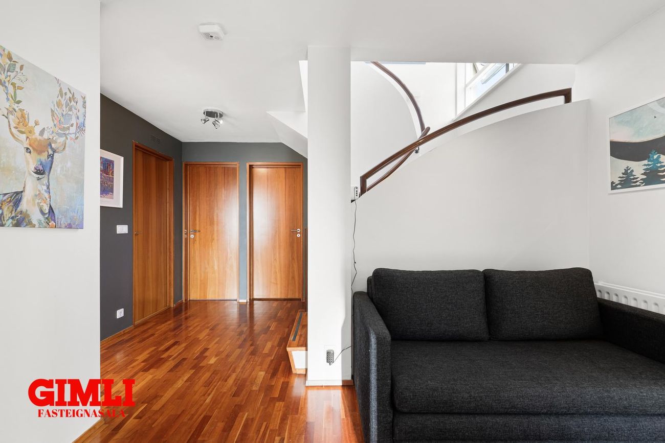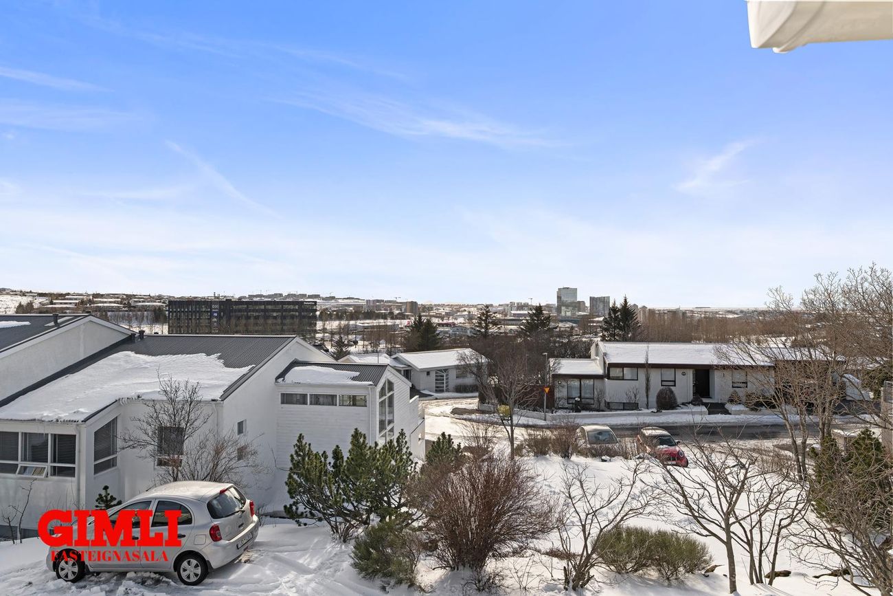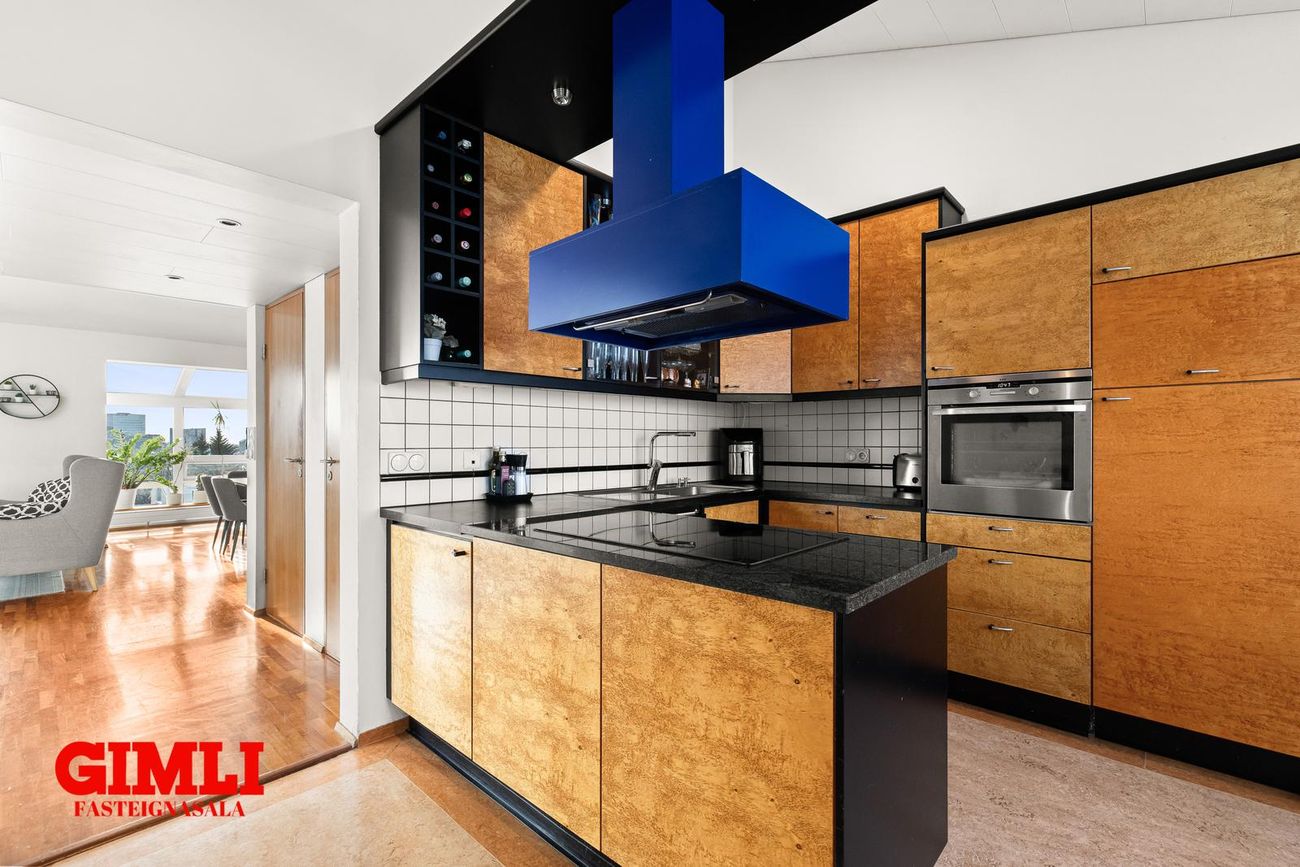 Efri hæð:Stofa og borðstofa mynda fallegt og bjart rými. Sólskálinn í suðurenda stofunnar er nýlega endurnýjaður og úr honum er gengt út á suðursvalir. Úr stofu er gengt út á skjólsæla afgirta verönd sem er ofaná bílskúrnum. Úr stofu er parketlagður stigi upp á ca 11 fm risloft, með opnanlegum þakglugga, sem notað er sem setustofa í dag. Risloftið er ekki inn í fermetratölu hússins. Á efri hæðinni er gestasalerni og einnig þvottaherbergi. Innst á hæðinni er stórt eldhús með U-laga eldhúsinnéttingu og síðan er stór eldhúskrókur við hlið eldhússins. Parket er á gólfum stofu og borðstofu en dúkur á eldhús gólfi.