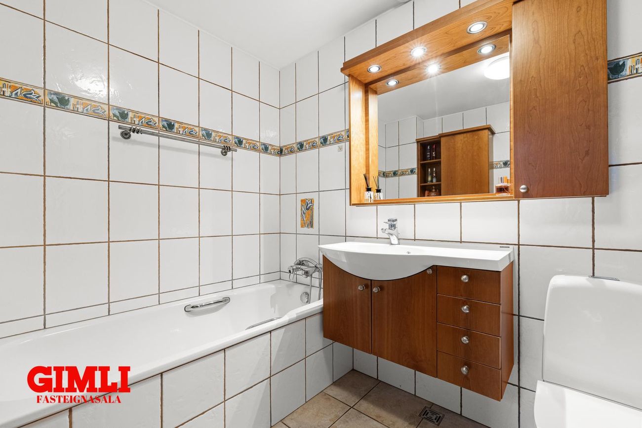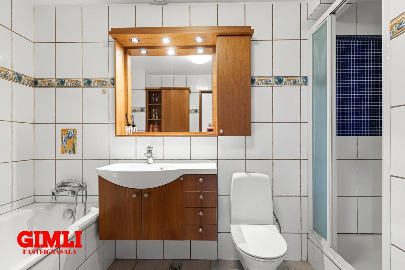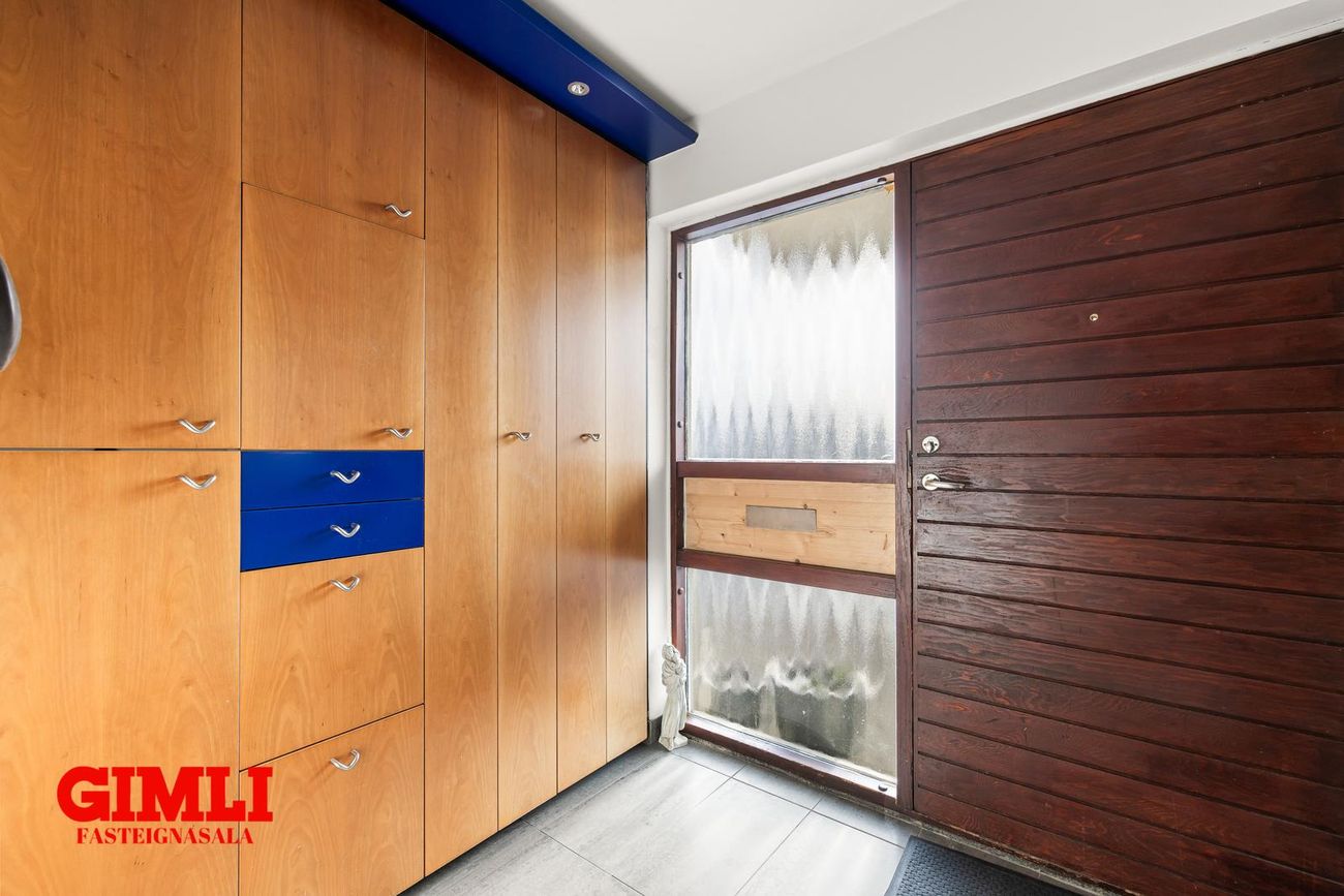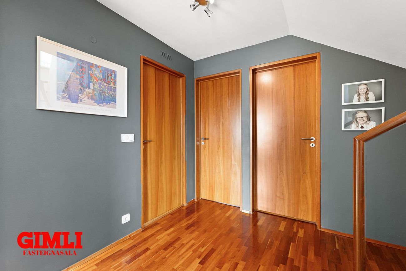 NÁNARI LÝSING:Jarðhæð:Aðalinngangur er á jarðhæð hússins og snýr í suður. Komið er inn í rúmgóða forstofu með flísum á gólfi og stórum fataskápum sem ná upp í loft. Síðan er er komið inn í hol með parket á gólfi og setukrók. Úr holinu er gengið inn í öll rými á hæðinni og þar er einnig parketlagður stigi upp á efri hæðina. Á jarðhæðinni eru þrjú svefnherbergi. Eitt við hlið inngangs en tvö innst á hæðinni, öll með kork á gólfi. Fremsta svefnherbergið er með stórum fataskápum. Úti, fyrir framan fremsta svefnherbergið, er hellulögð verönd. Baðherbergið er með flísum á gólfi og á veggjum upp undir loft. Þar er bæði baðkar og sturta, einnig vaskainnrétting, speglaskápur og handklæðaofn.