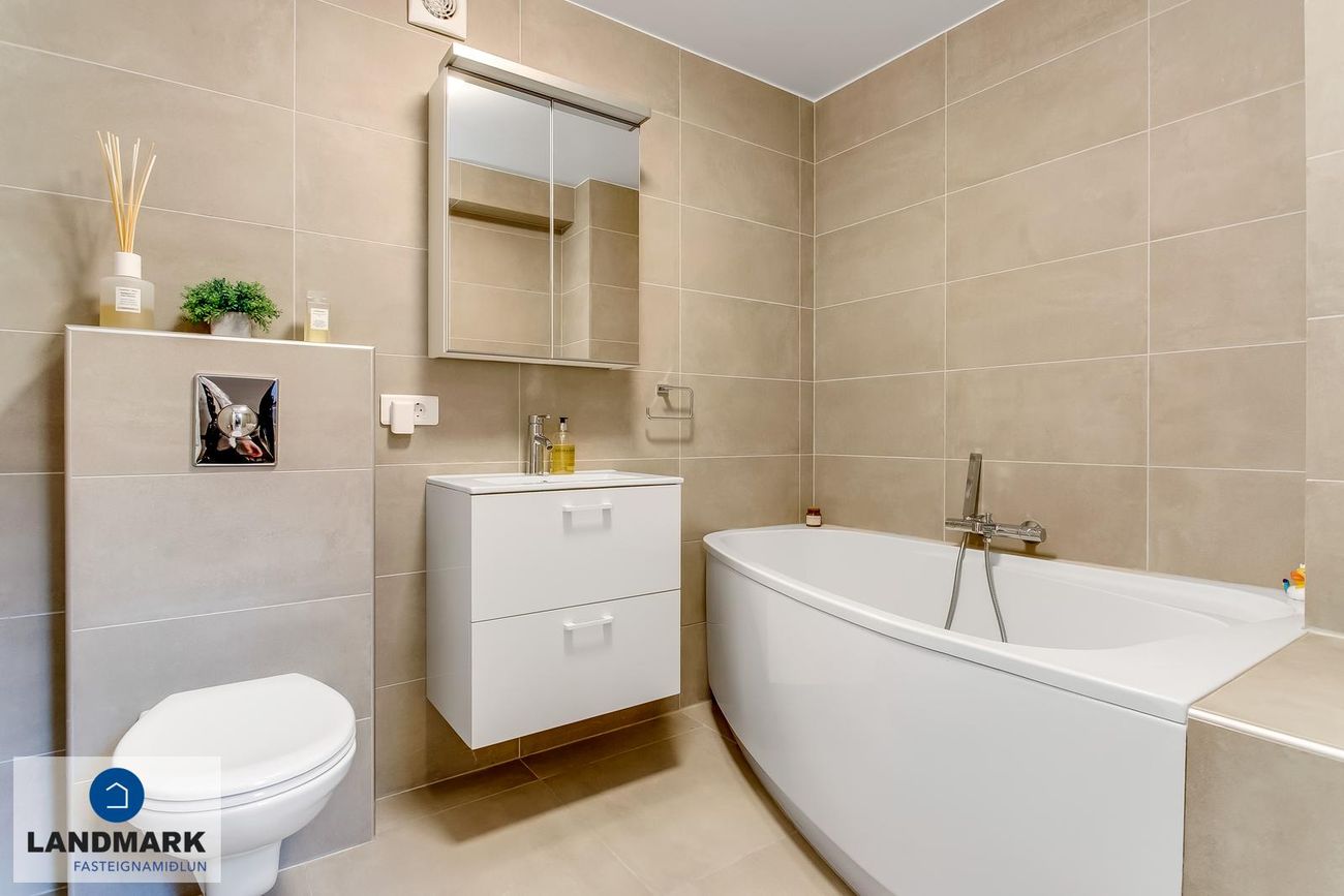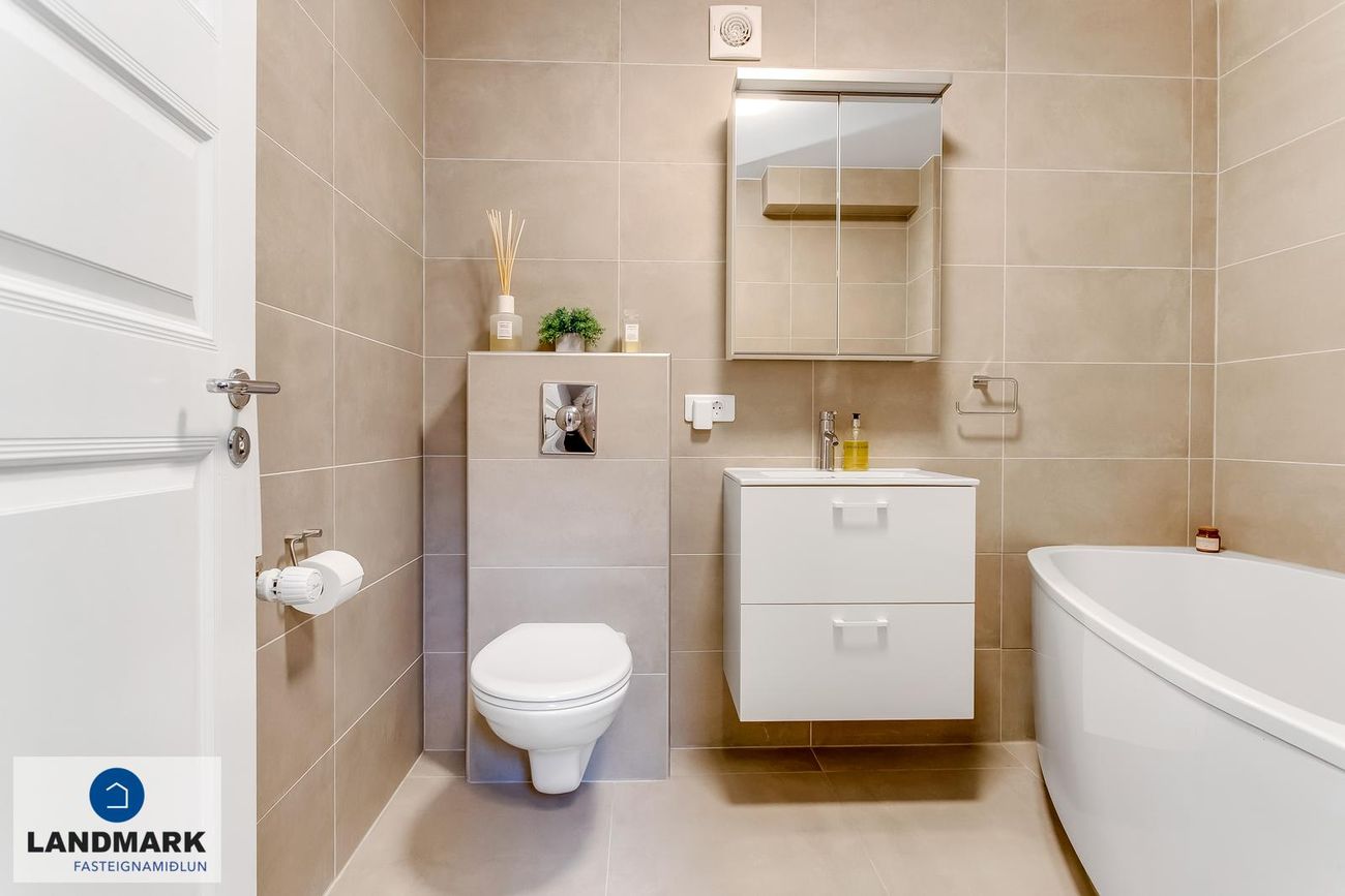 Nýlega endurnýjað baðherbergi með hornbaðkari, handklæðaofni og flísalegðum hólfum. Walk-in sturta í baðherbergi á efri hæð.