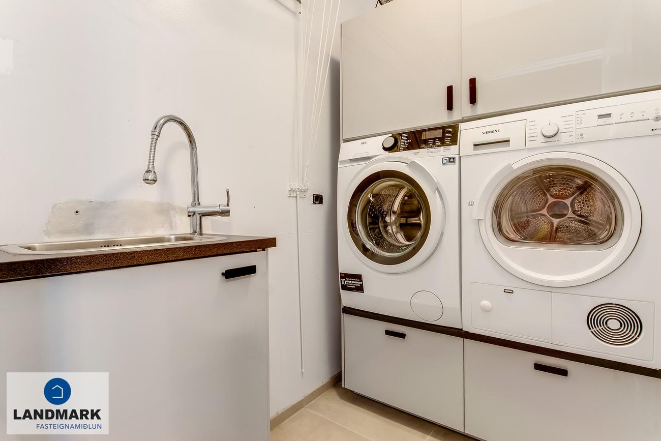 Þvottahús á neðri hæð með innréttingu og tækjum í góðri vinnuhæð.