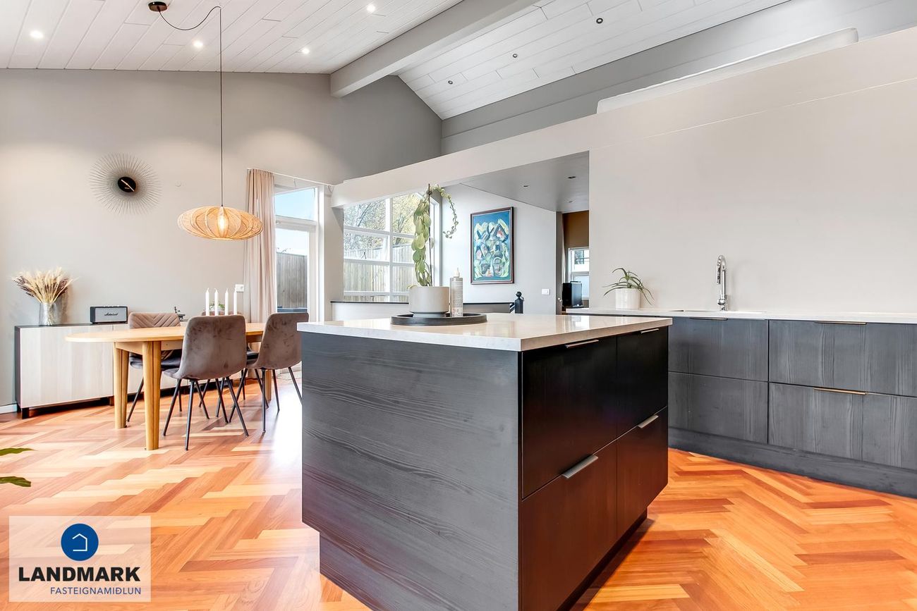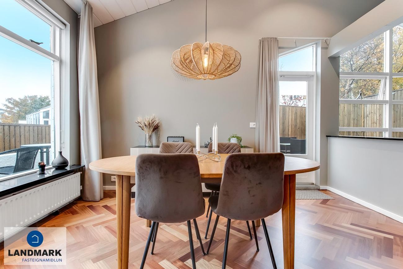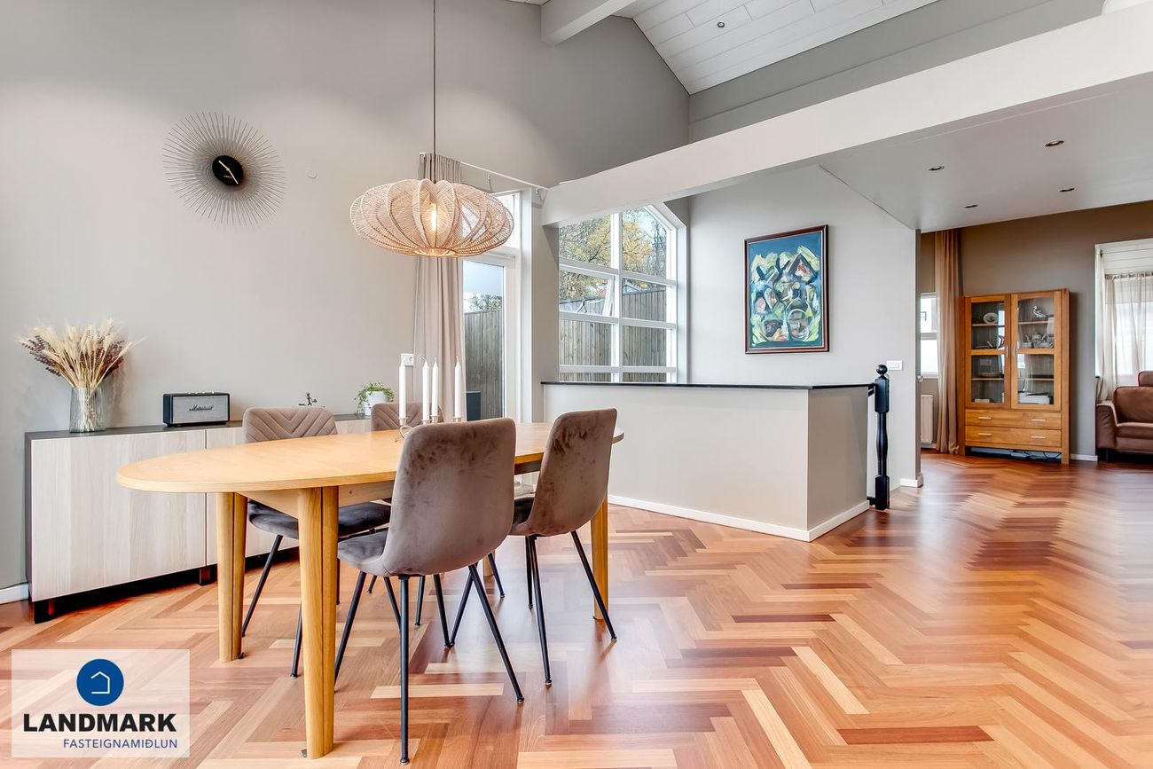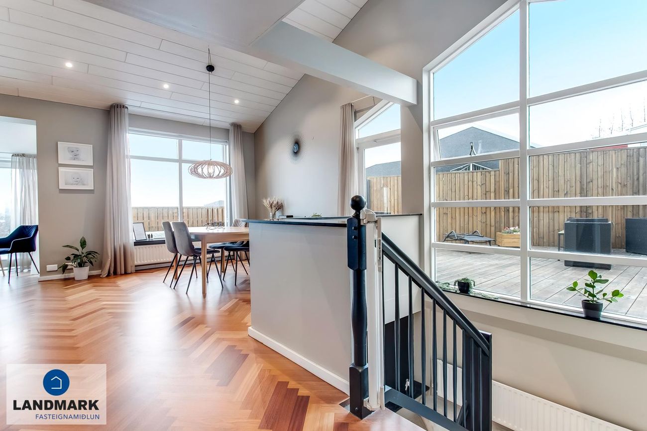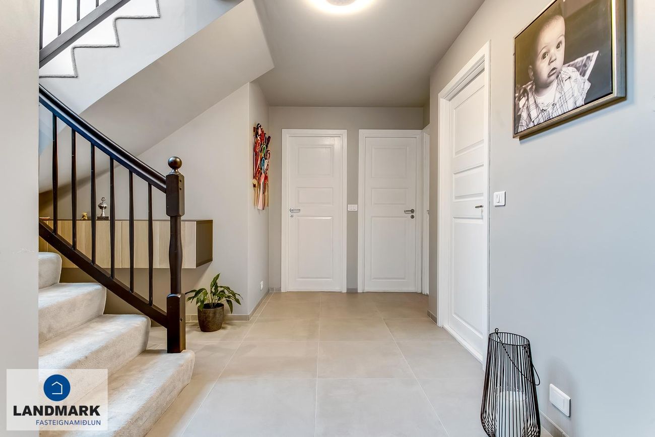 194,1 fm parhús með 5-6 herbergi, 3-4 svefnherbergi, risloft og bílskúr. Nýlega endurnýjuð baðherbergi, eldhús og þvottahús. Opinn flokkur með aukinni lofthæð.