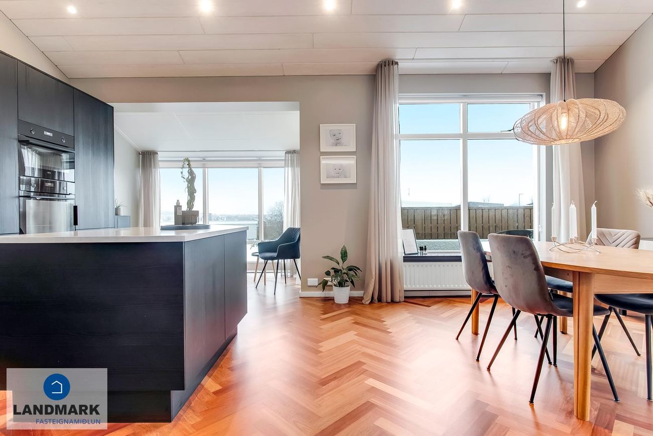 Opinn flokkur með borðstofu og setustofu í björtu rými með aukinni lofthæð og suðvesturútsýni.