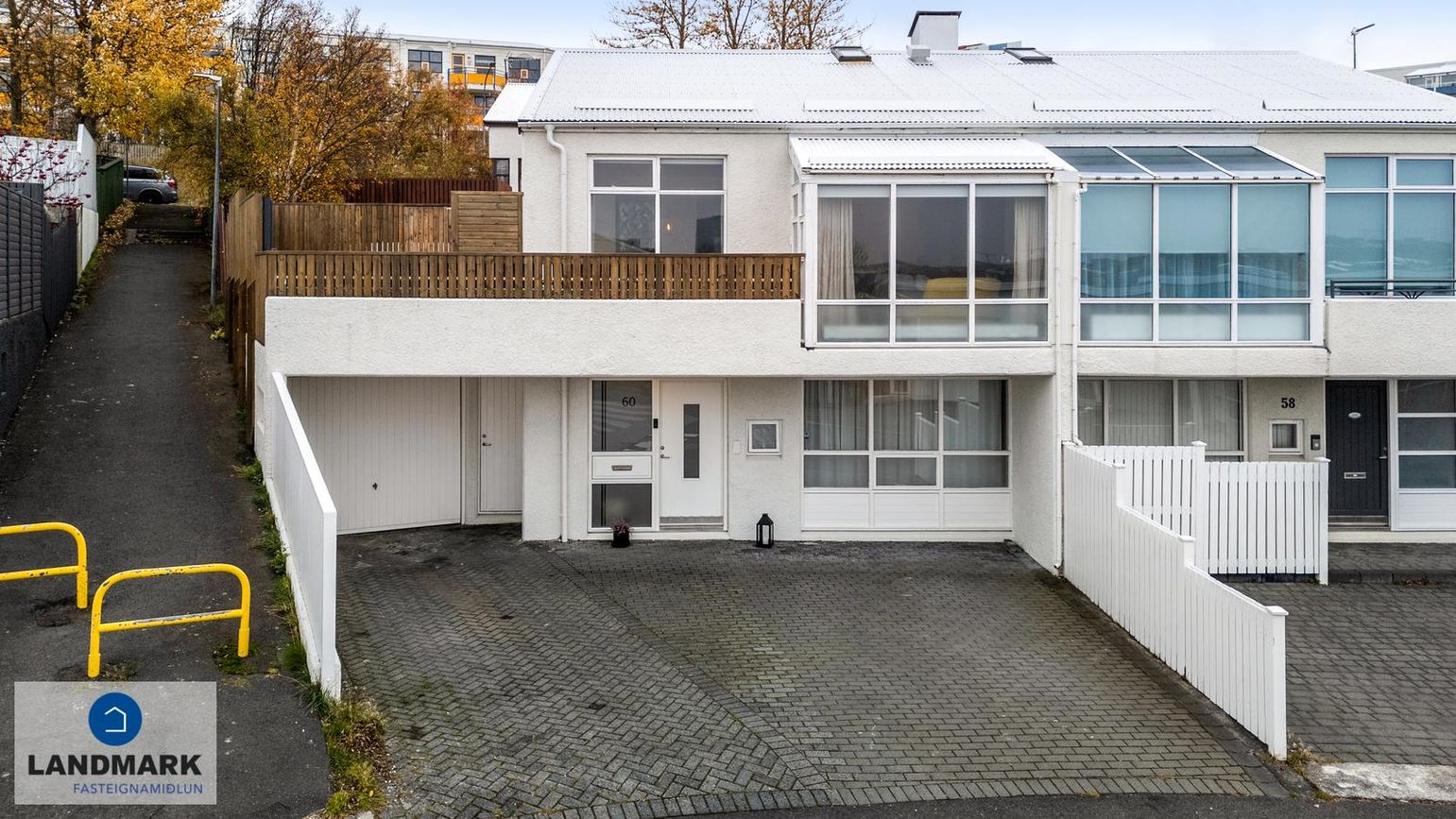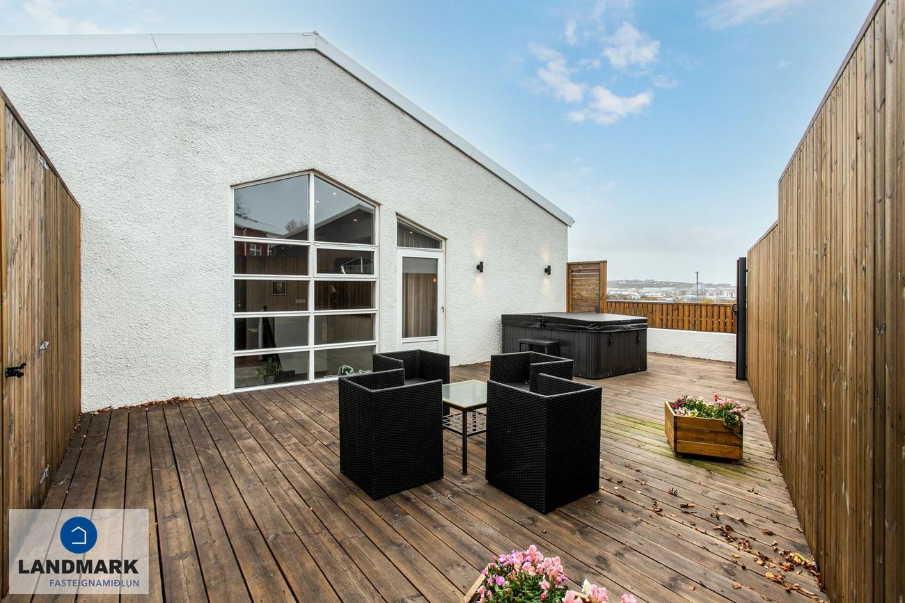 Tveggja hæða parhús með opnu rými, rislofti og verönd með heitum potti. Húsið hefur gott skjólvegg og innangöngu í bakgarð.