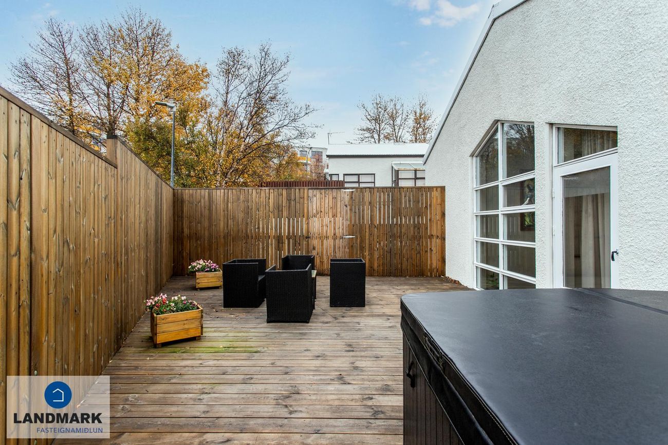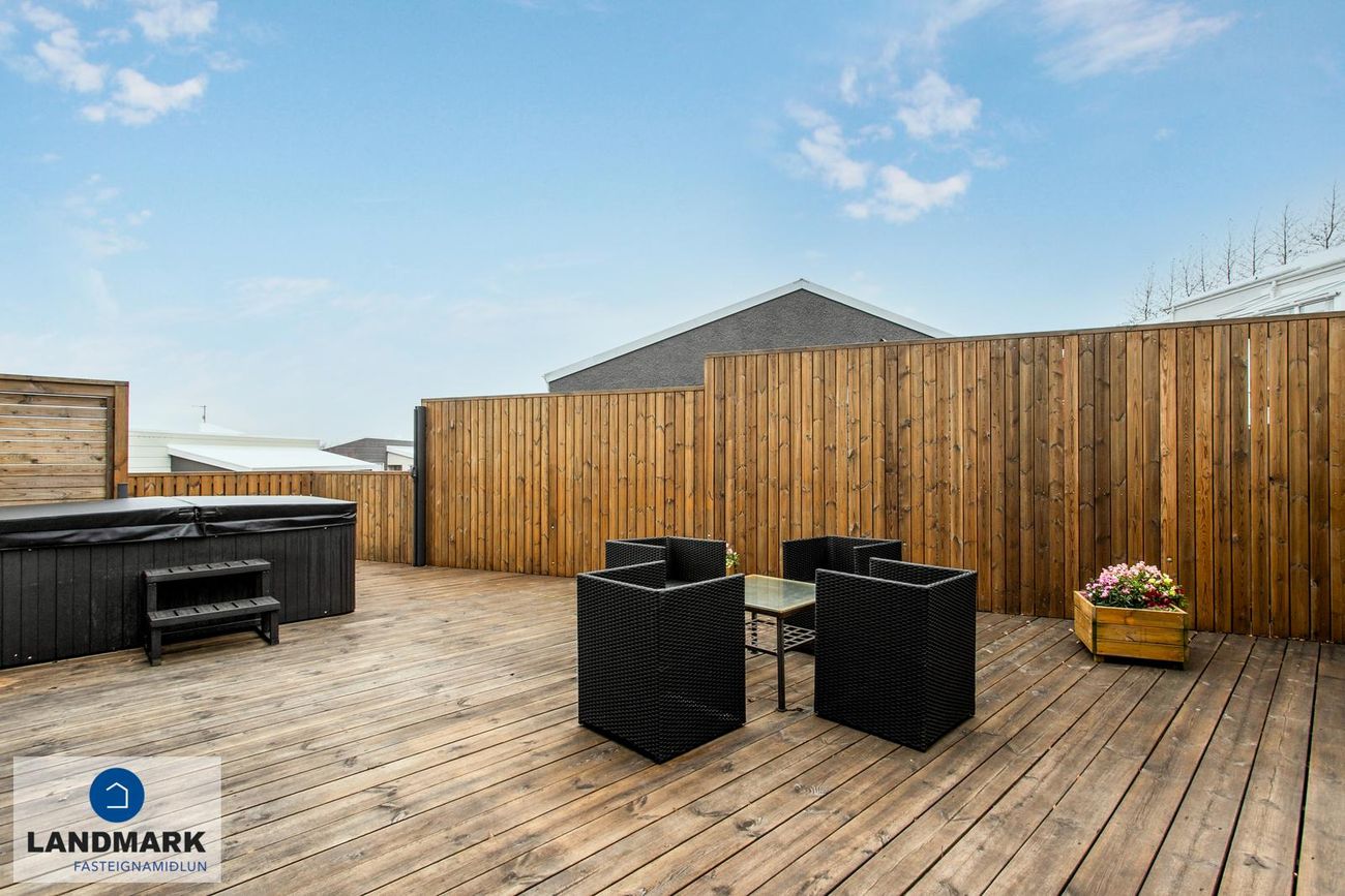 Verönd með heitum potti og innangöngu í bakgarð. Skjólveggur á verönd.