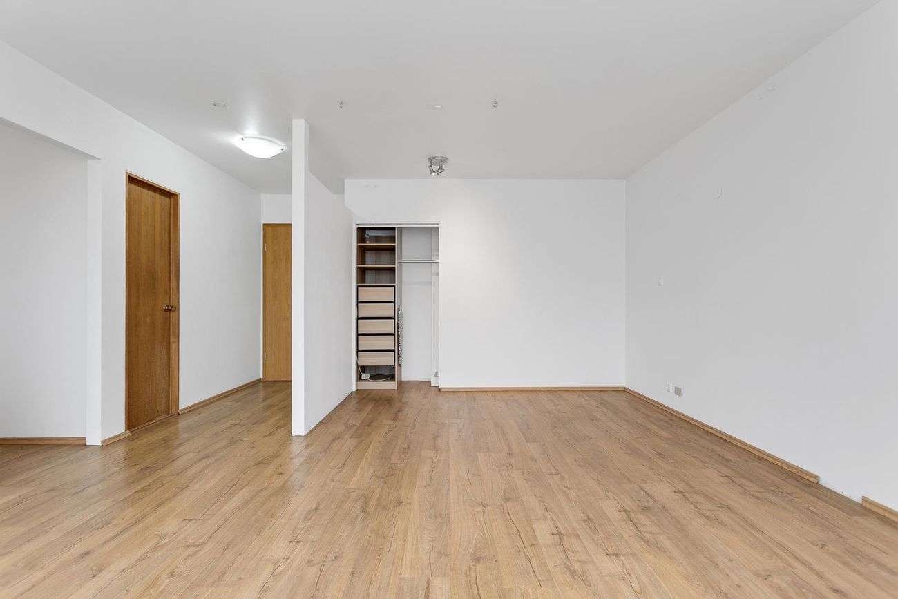 Komið er inn í íbúðina um parketlagða forstofu. Á gólfum alrýma íbúðarinnar er ljóst parket sem gefur rýminu hlýlegt yfirbragð. Gengið er í alrými íbúðarinnar beint úr forstofunni. Íbúðin er einkar björt með stórum gluggum sem vísa í suður og hleypa mikilli birtu og hlýju inn. Úr alrýminu er opið inn í eldhúsið sem er í sérrými. Eldhúsið er rúmgott með góðri innréttingu og fínu vinnuplássi. Skipt var um eldavél 2021.