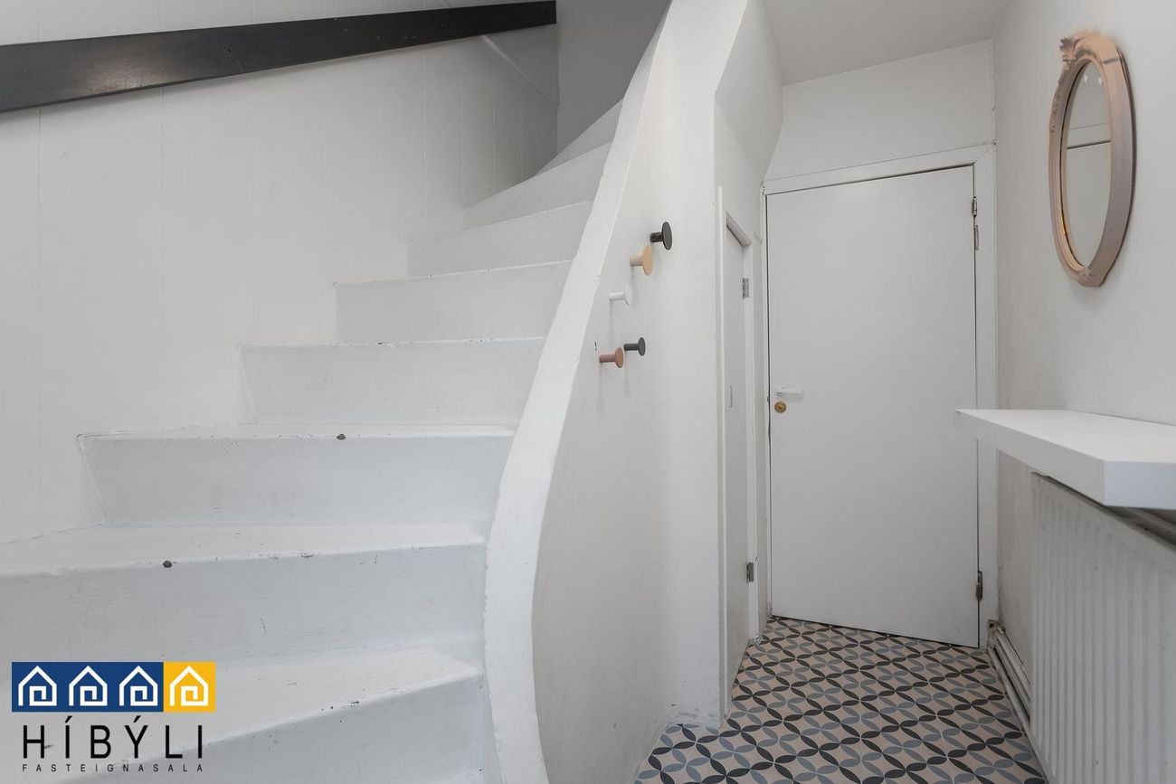 Stigapallur á efri hæð er með harðparketi á gólfi, fatahengi og glugga.