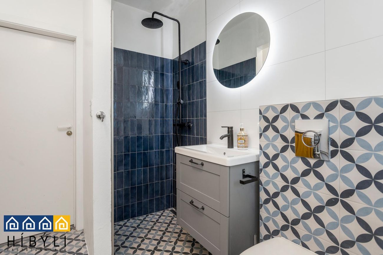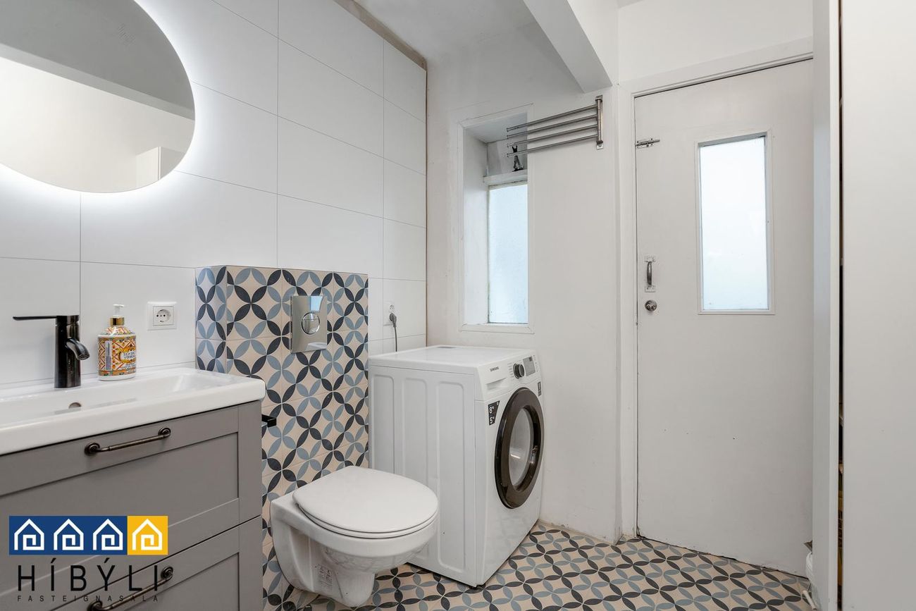 Baðherbergi: Endurnýjað 2025, flísar á gólfi, flísalagður sturtuklefi, grá viðarinnrétting undir vaski, upphengt salerni, tengi fyrir þvottavél, gluggi, útgengt í bakgarð hússins sunnan við húsið.