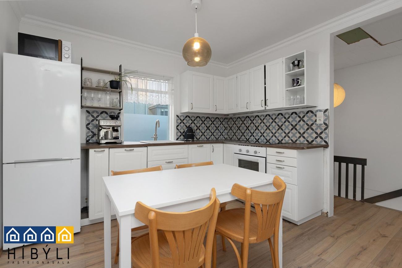 Setustofa: Opin við eldhús, harðparket á gólfi, gluggi sem snýr inn í garðinn til suðurs.