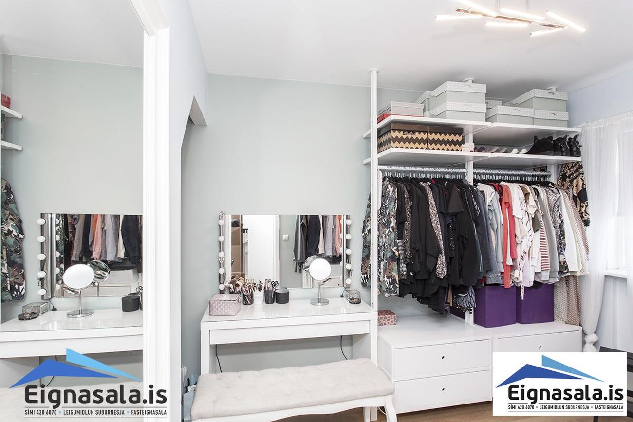 Tvö barnaherbergi með skápum. annað þeirra nýtt sem fataherbergi..