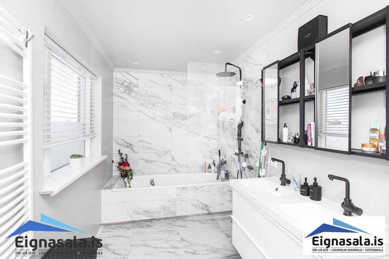 Stórt baðherbergi, sem búið er að endurnýjað með sturtuklefa og baðkari, nýrri innréttingu, vegghengdu salerni og handklæðaofni. Gólfhiti og flísar á gólfum og hluta veggja. Þvottaaðstaða inná baðherbergi.