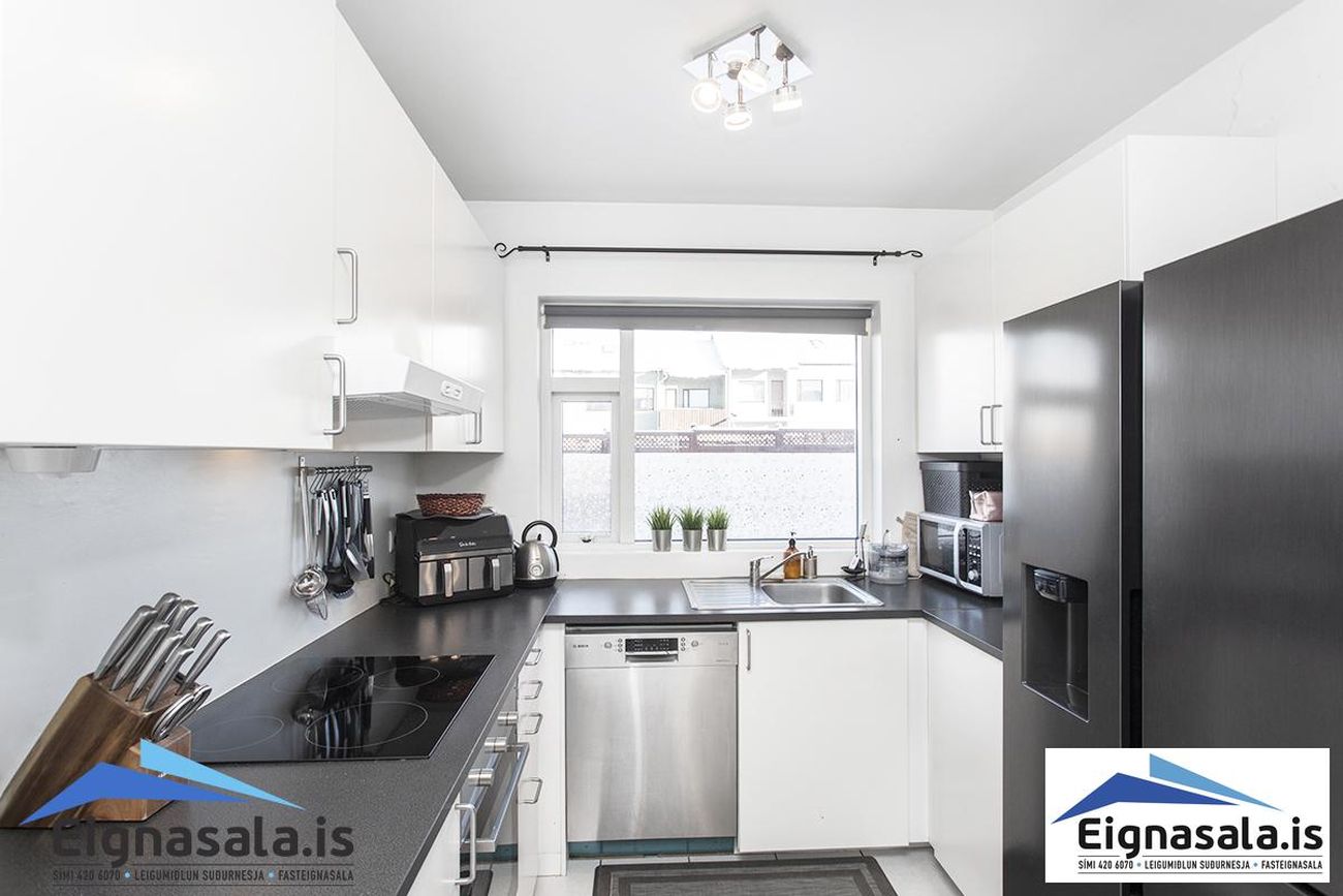 Eldhús með borðkrók og hvítar innréttingar með plastlagðri borðplötu, uppþvottavél fylgir. Flísar á gólfum