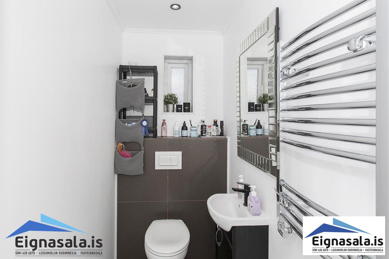 Gestasalerni sem búið er að endurnýja með vegghengdu salerni, flísar á gólfi og við salerni. Ný innrétting og handklæðaofn.