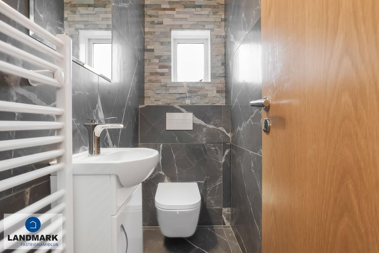 Gestasalerni (endurnýjað 2023) er innaf forstofu með flísum/steini á gólfi og veggjum, upphengdu salerni og handklæðaofni.