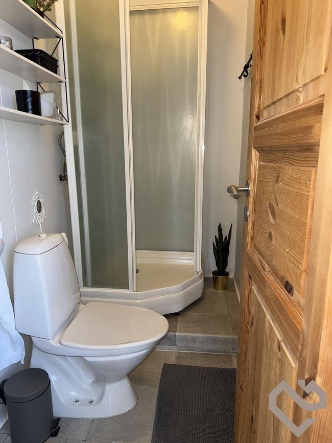 Baðherbergi: Flísar á gólfi, sturtuklefi, wc, vaskur
