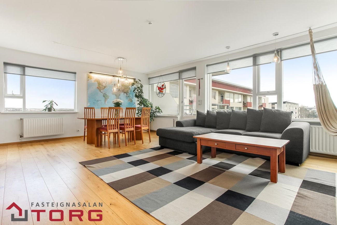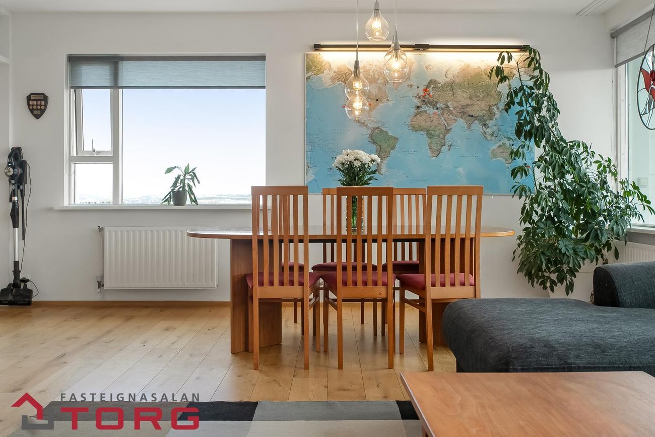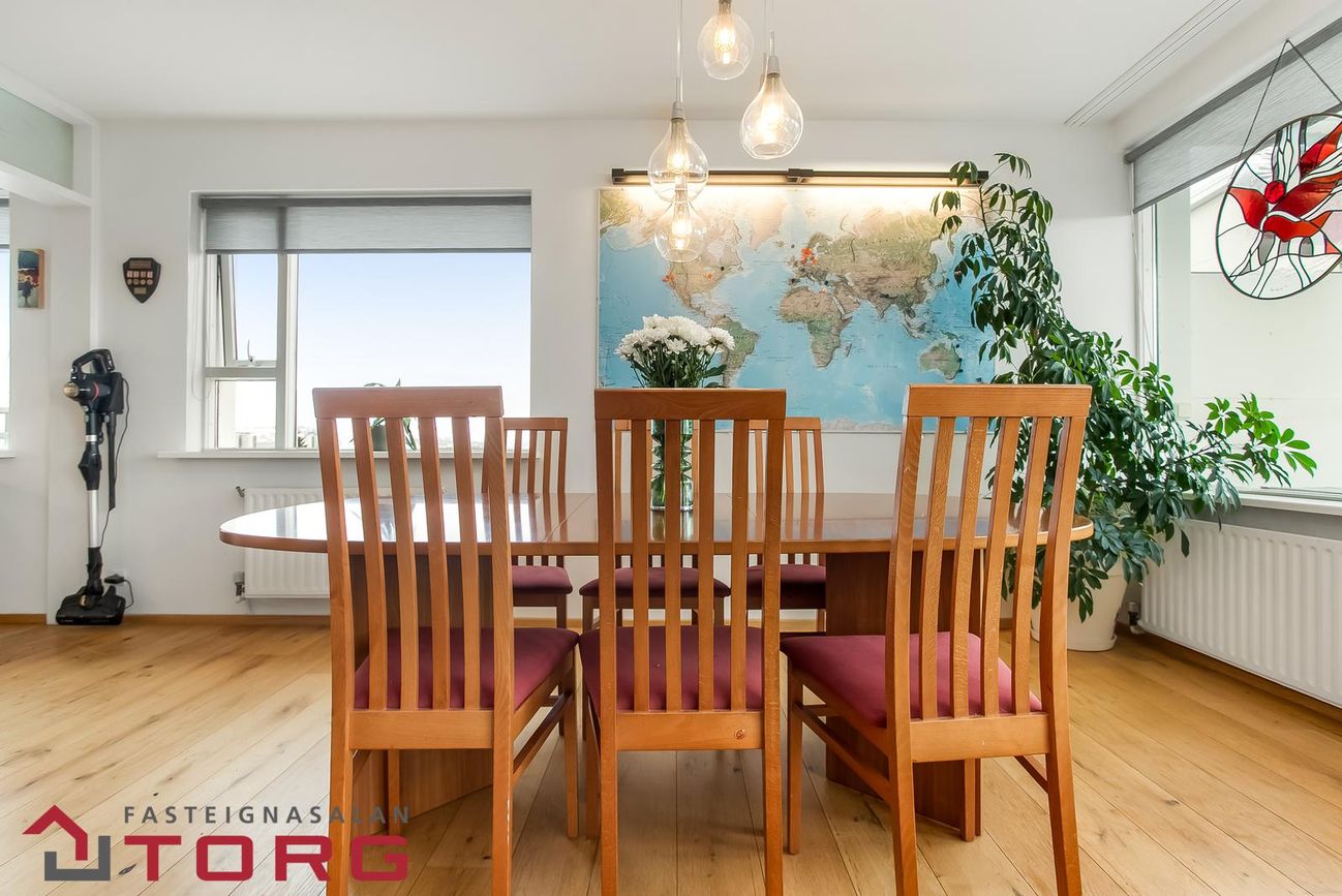 Stutt í alla helstu þjónustu, Kringluna, skóla og leikskóla. Virkilega björt og falleg eign, með miklu útsýni, sem vert er að skoða.