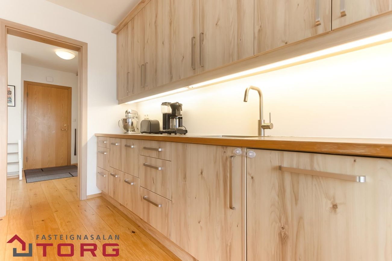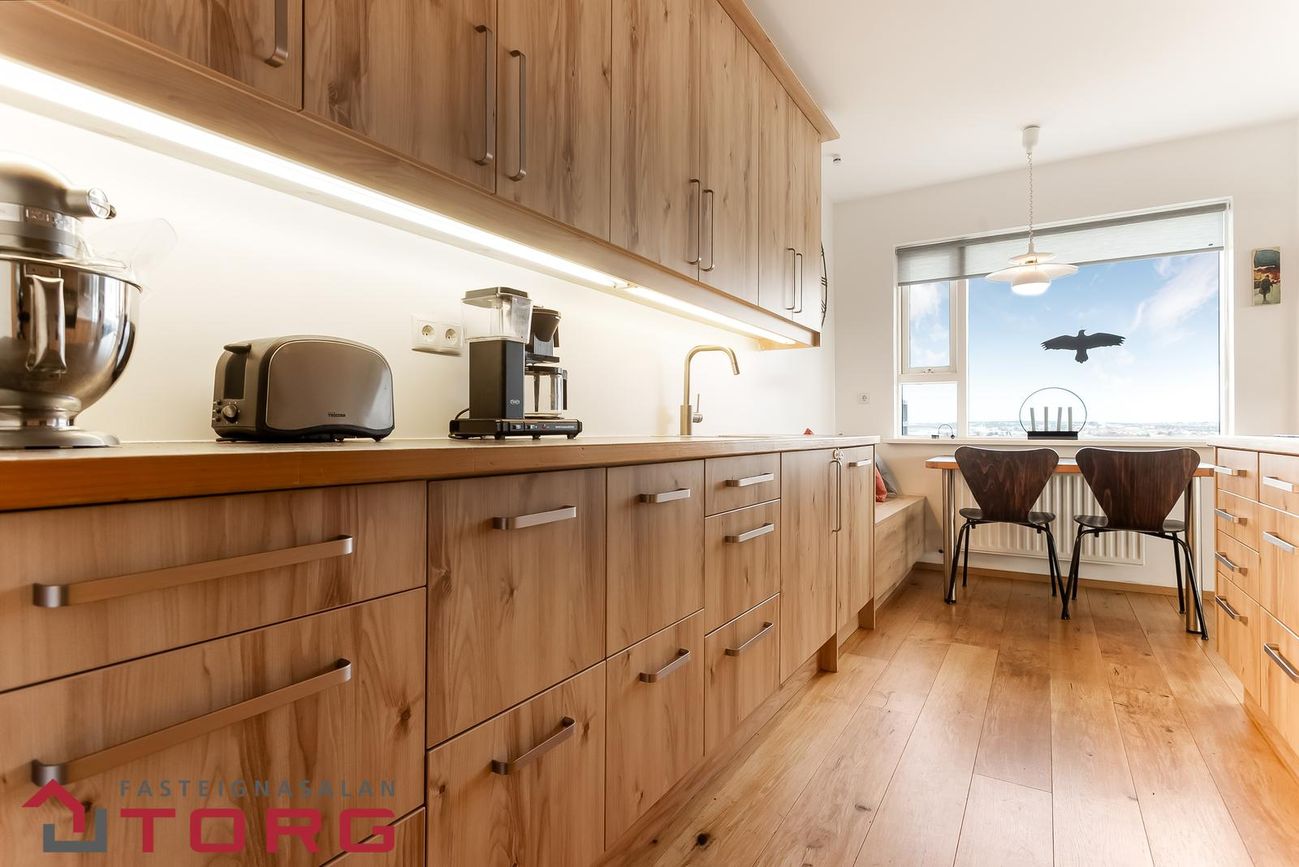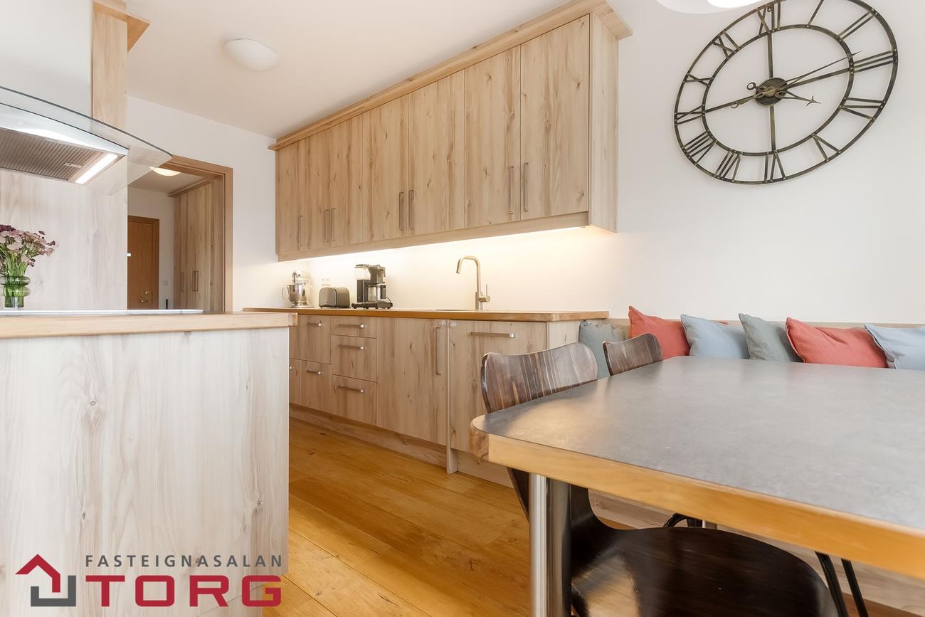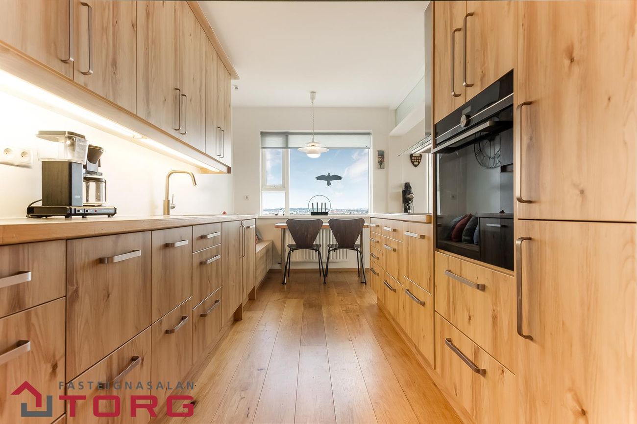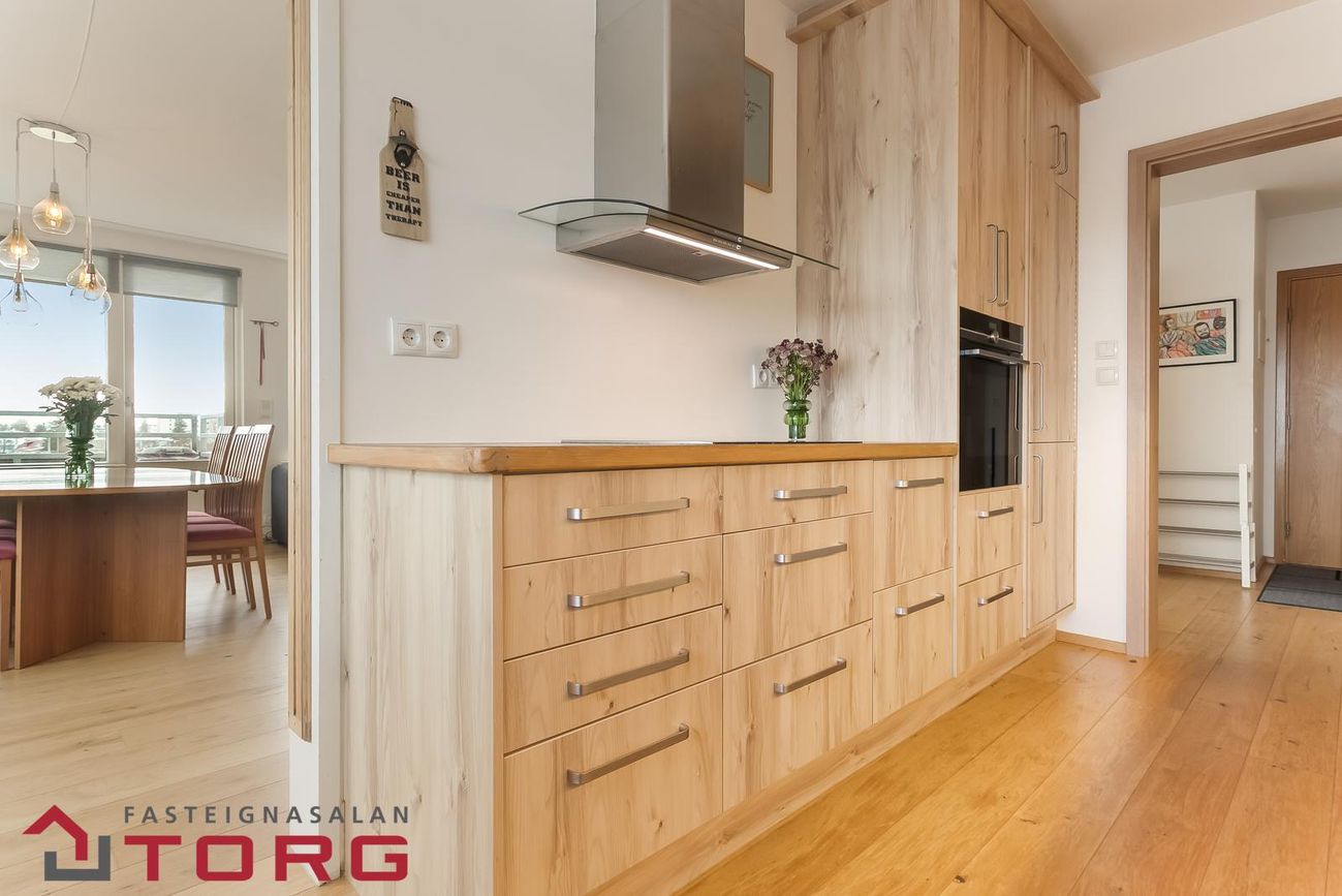 Eldhús: Sérsmíðaðar innréttingar, innbygð uppþvottavél og ísskápur. Bakaraofn í vinnuhæð og spanhelluborð. Eldhúsborð og eldhúsbekkur. Gegnheilt viðarparket á gólfi. Fallegt útsýni til austurs.