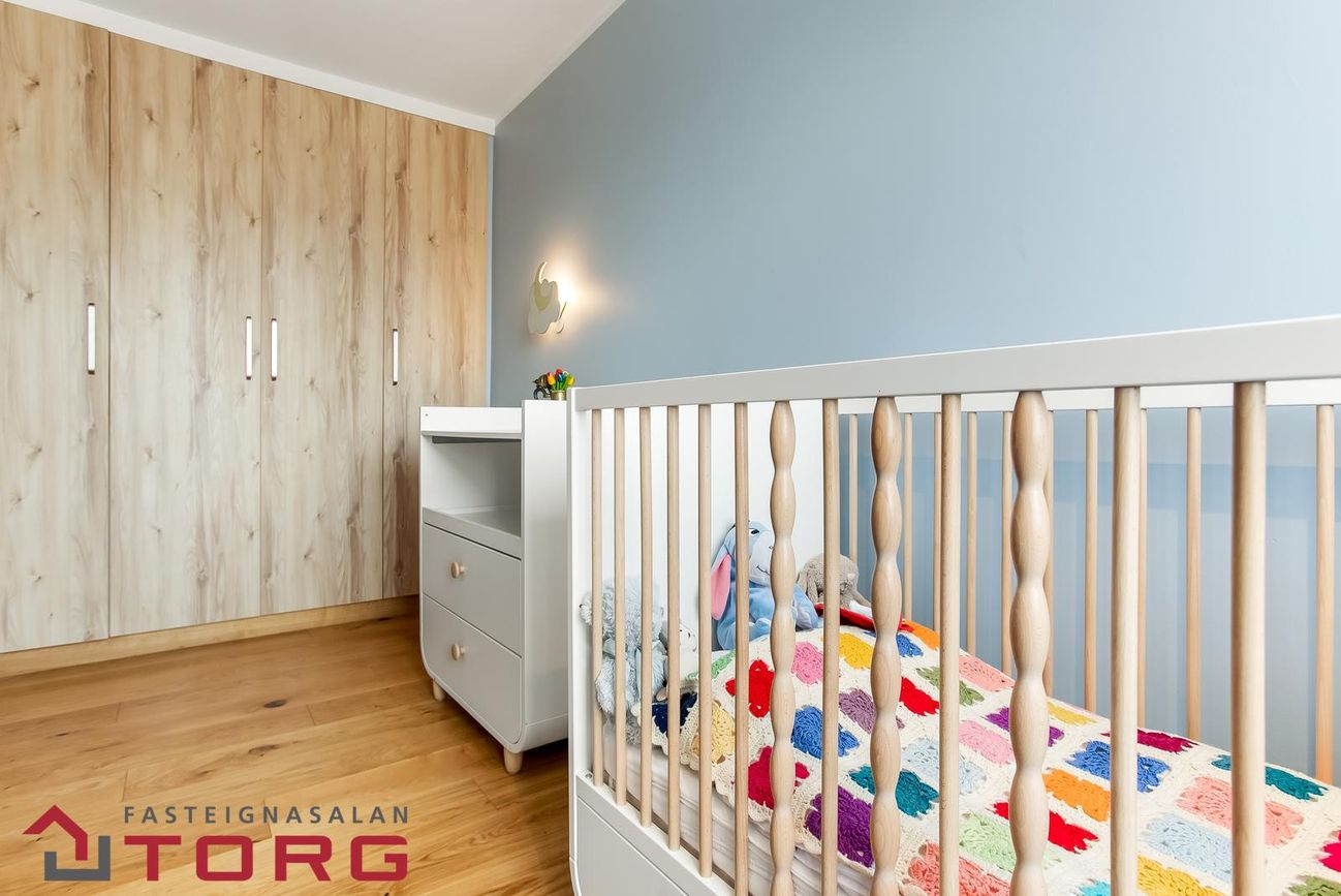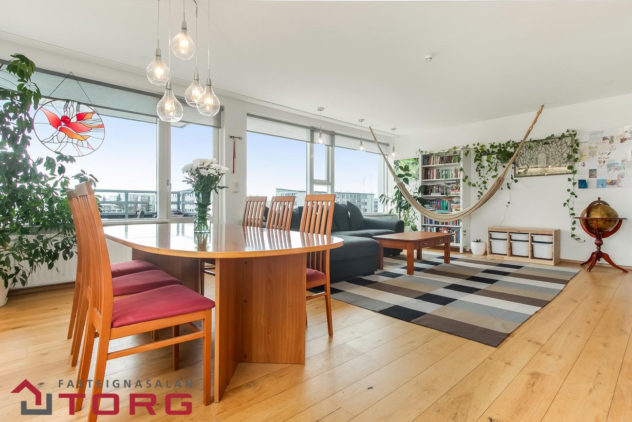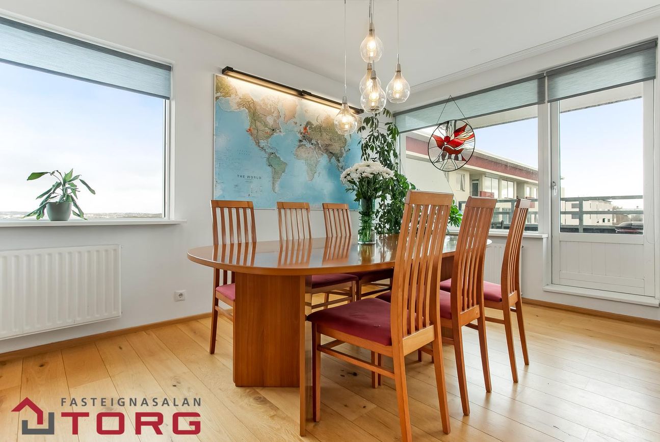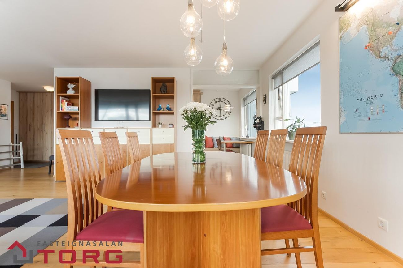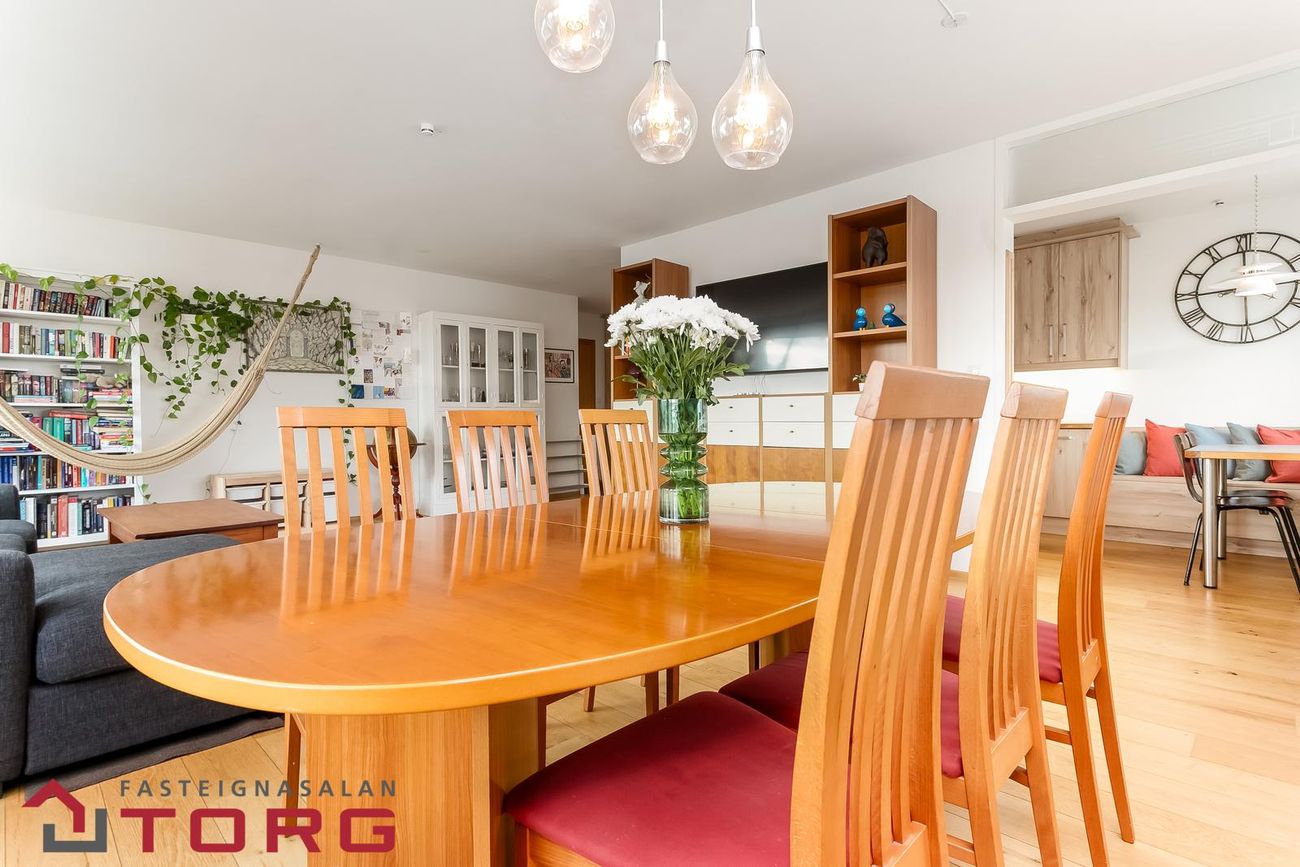 Eldhús: Sérsmíðaðar innréttingar, innbygð uppþvottavél og ísskápur. Bakaraofn í vinnuhæð og spanhelluborð. Eldhúsborð og eldhúsbekkur. Gegnheilt viðarparket á gólfi. Fallegt útsýni til austurs.