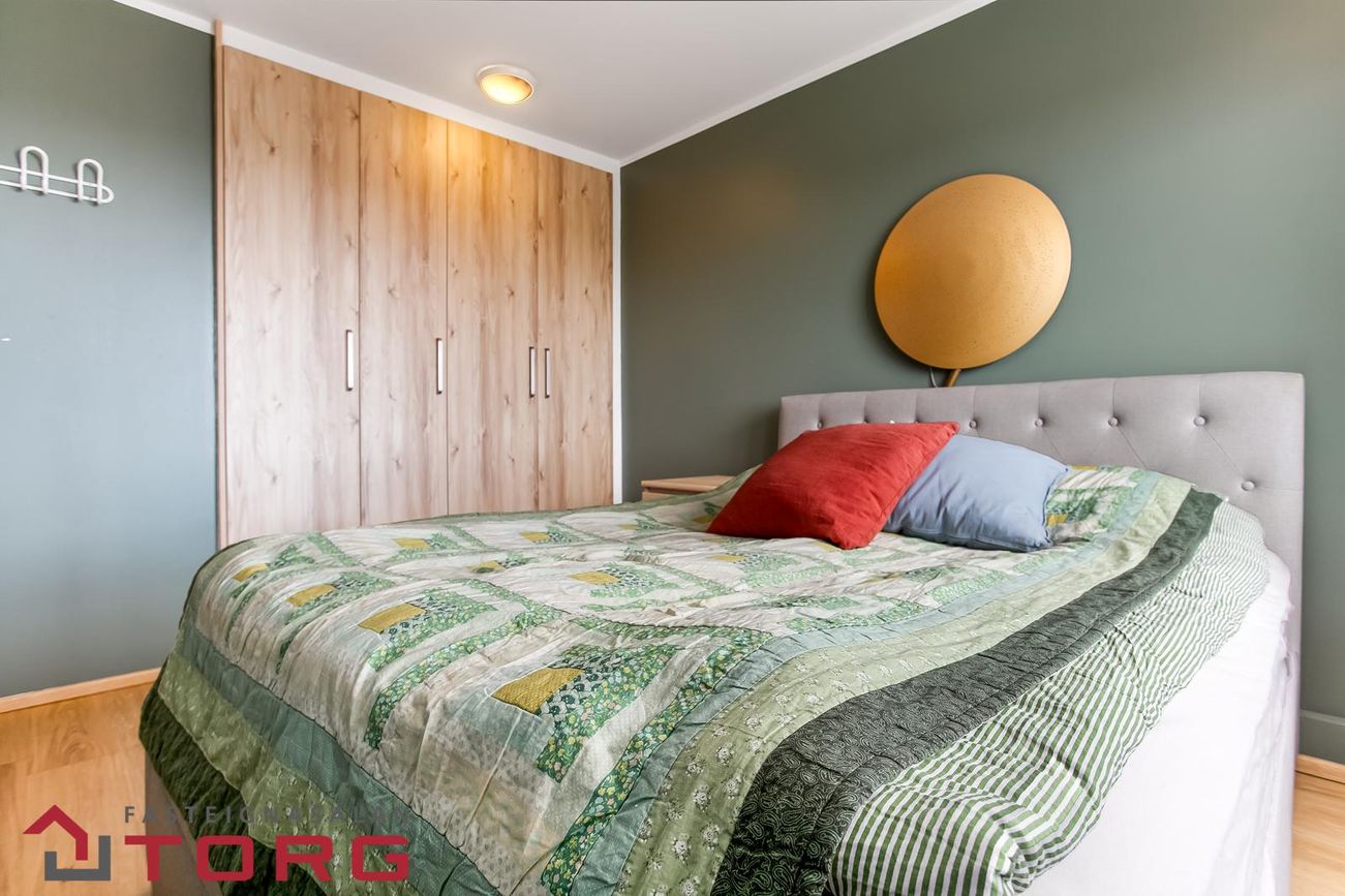 Herbergi II: Gegnheilt viðarparket á gólfi og fataskápum sem nær upp í loft.. Útsýni til norðurs.
