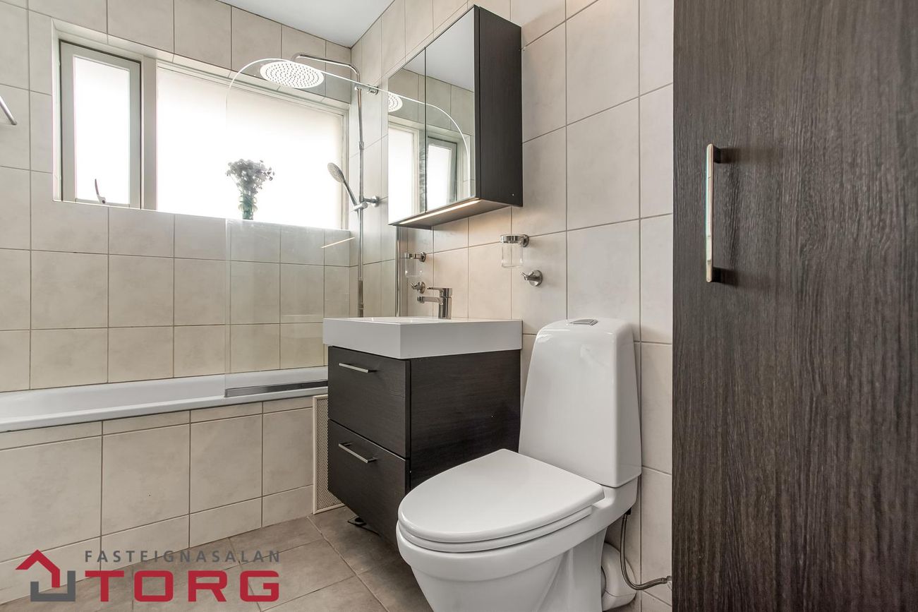 Baðherbergi: Flísalagt í hólf og gólf, baðkar með sturtu og dökk viðarlituð innréttng ásamt speglaskápi. Gluggi með opnanlegu fagi.