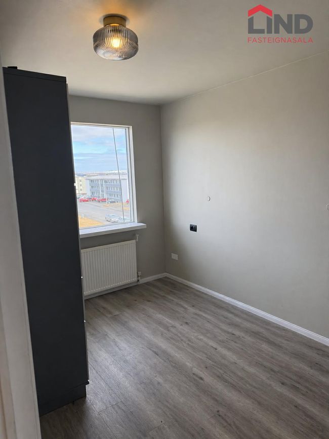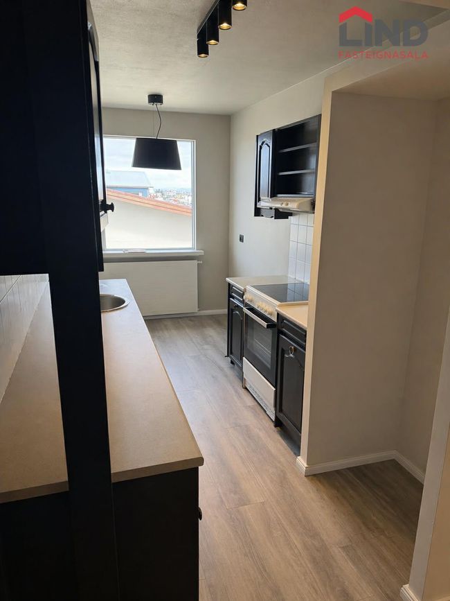 Nánari lýsing:Eldhús hefur harðparket á gólfi, stæði fyrir ísskáp, ofn og helluborð.