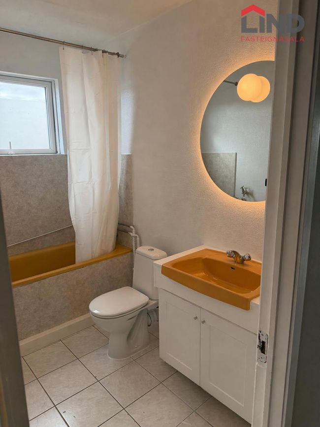 Baðhebergi hefur flísar á gólfi og veggjum, baðkar með sturtuaðstöðu, innrétting, nýtt klósett. tengi fyrir þvottavél og þurrkara.