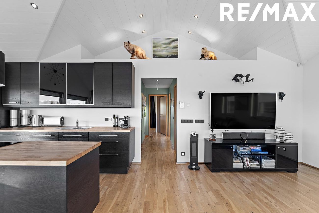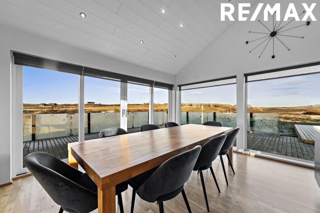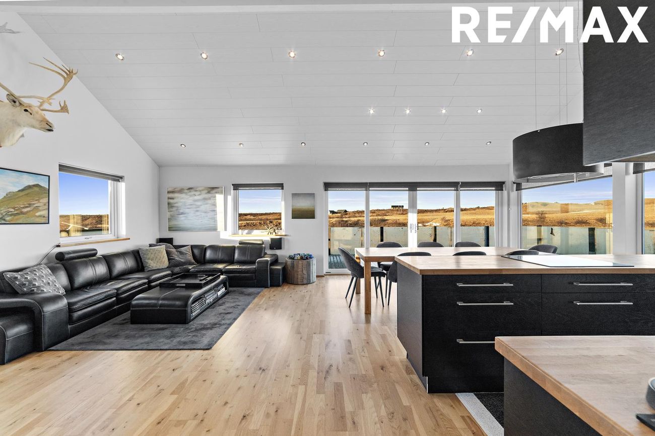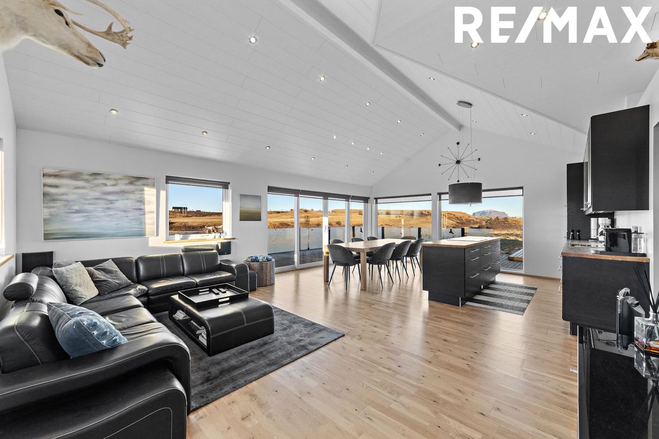 Sofa/borðstofa: Eru í rúmgóðu rými með gólfsíðum gluggum, stór rennihurð er út á sólpall. Gegnheilt parket á gólfi ásamt hita. Vönduð lýsing er í húsinu með fjarstýringu í stofu.