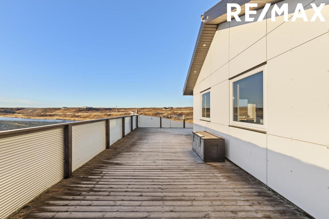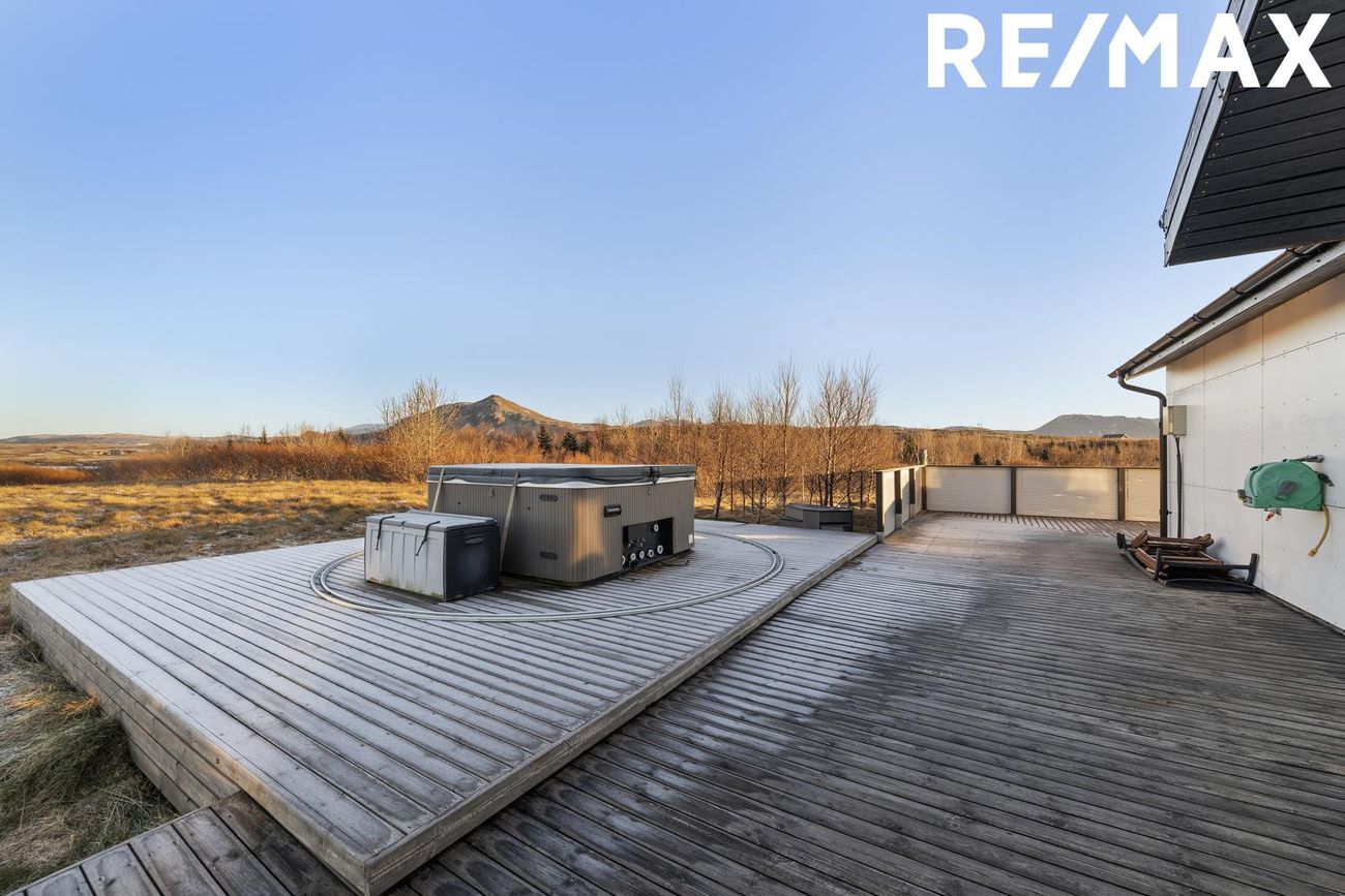 Sólpallur: Er 300fm að stærð með hertu gleri ásamt heitum og glerkúlu frá Jóni Bergs (sem þarf að setja upp eftir viðhald)