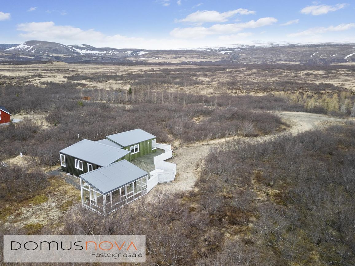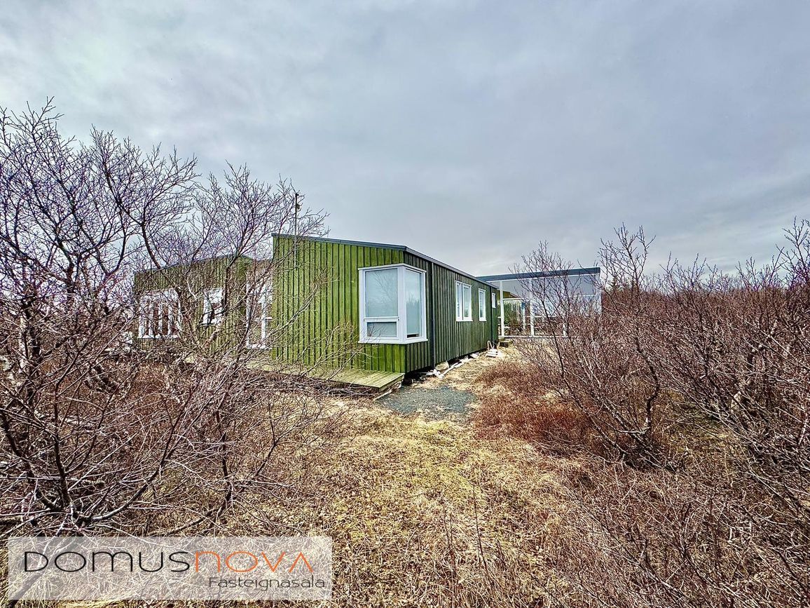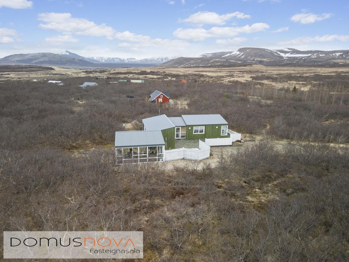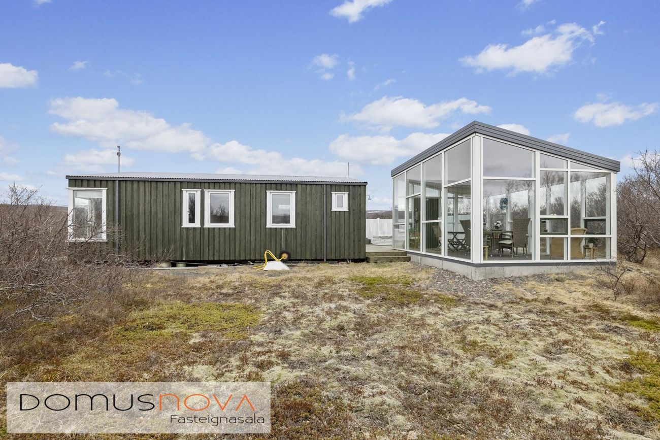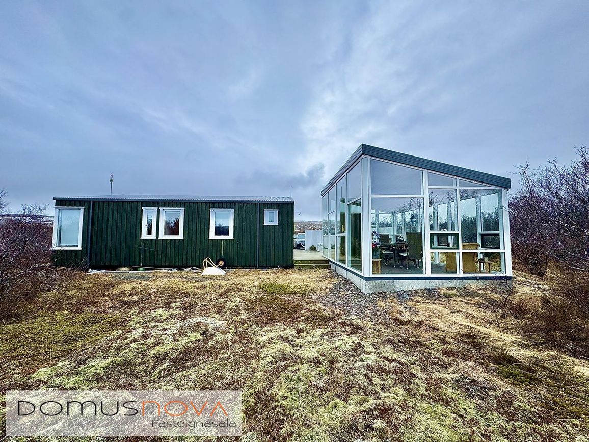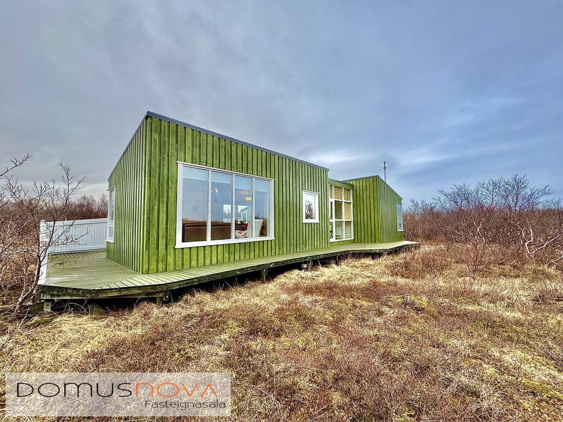 Aðalhús 76,8 fm og gestahús 22 fm á 6.500 fm leigulóð. Opinn grunnhönnuður rými með parketgólfum og aukinni lofthæð.