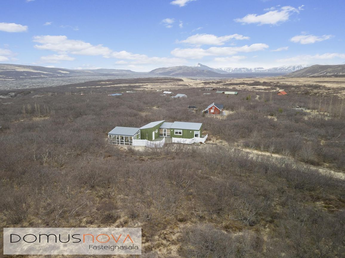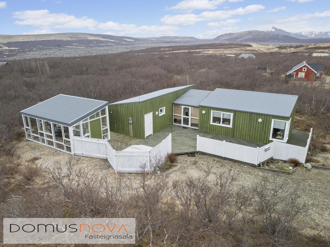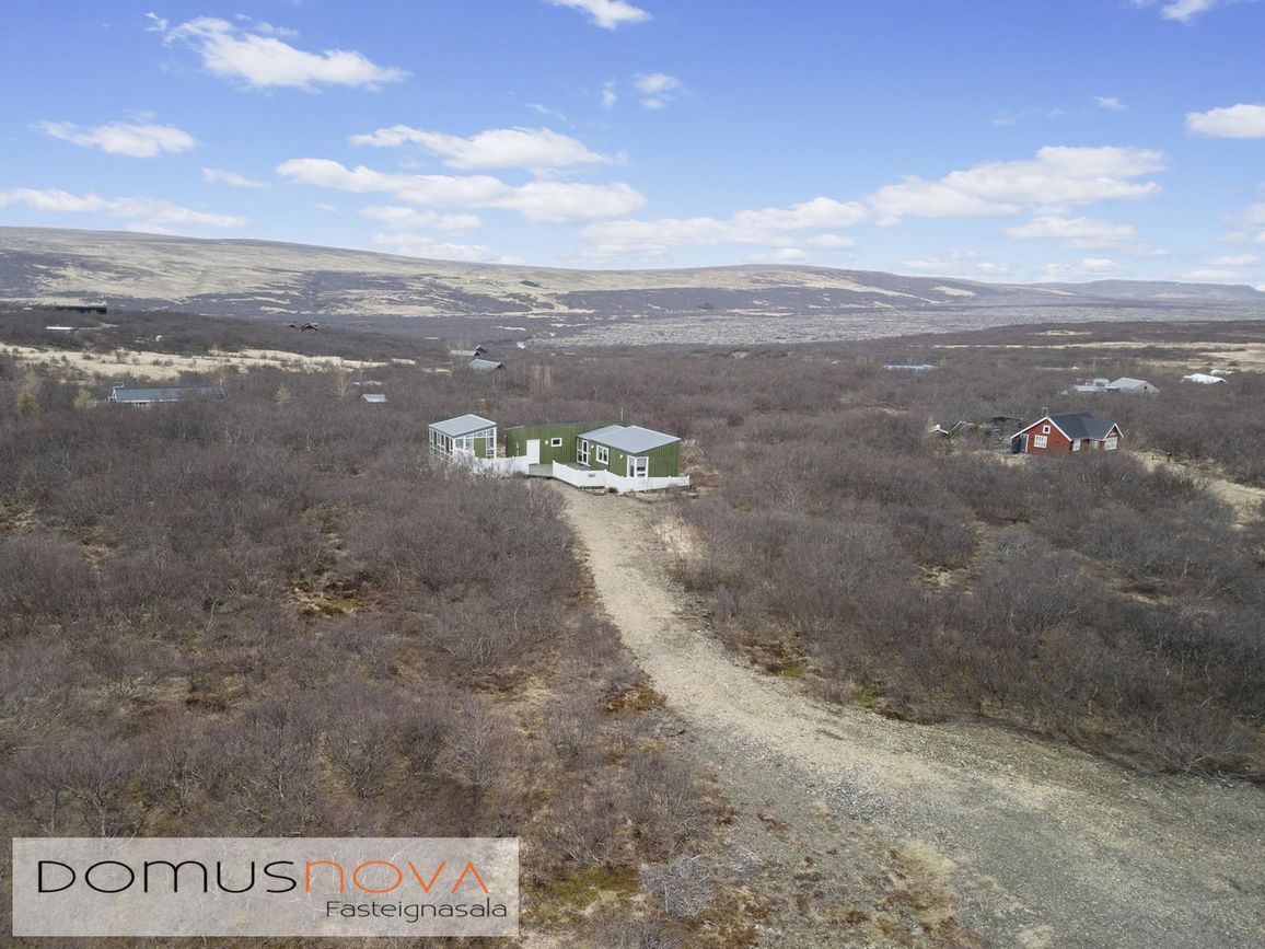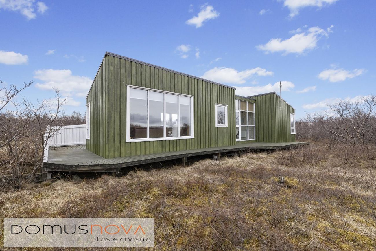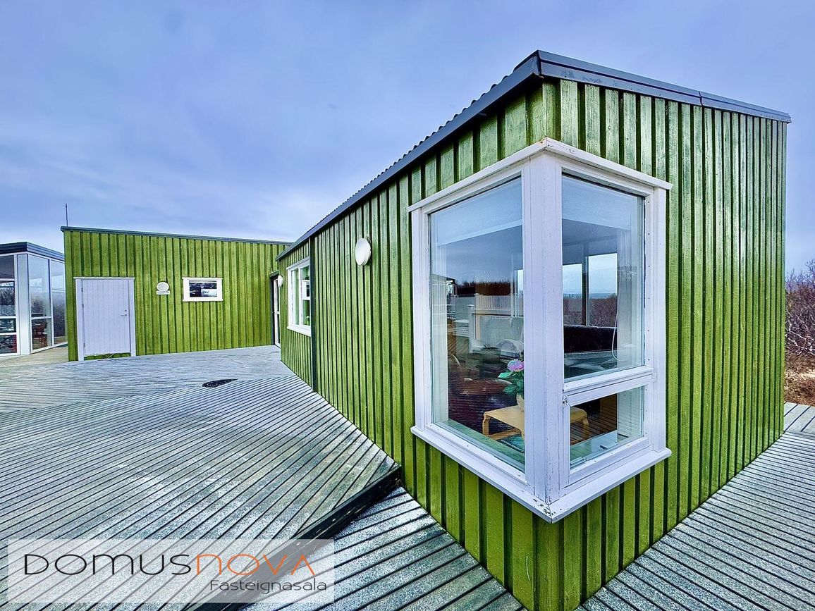 Aðalhús 76,8 fm og gestahús 22 fm á 6.500 fm leigulóð. Opinn grunnhönnuður rými með parketgólfum og aukinni lofthæð.