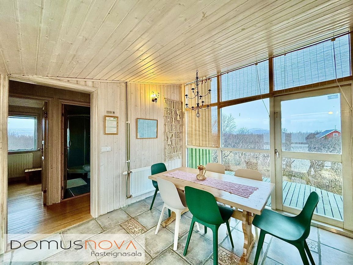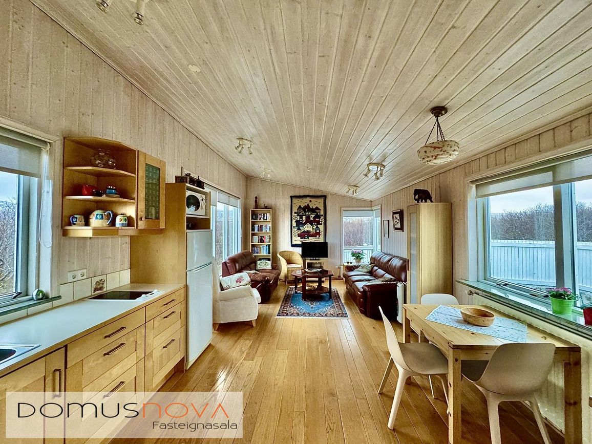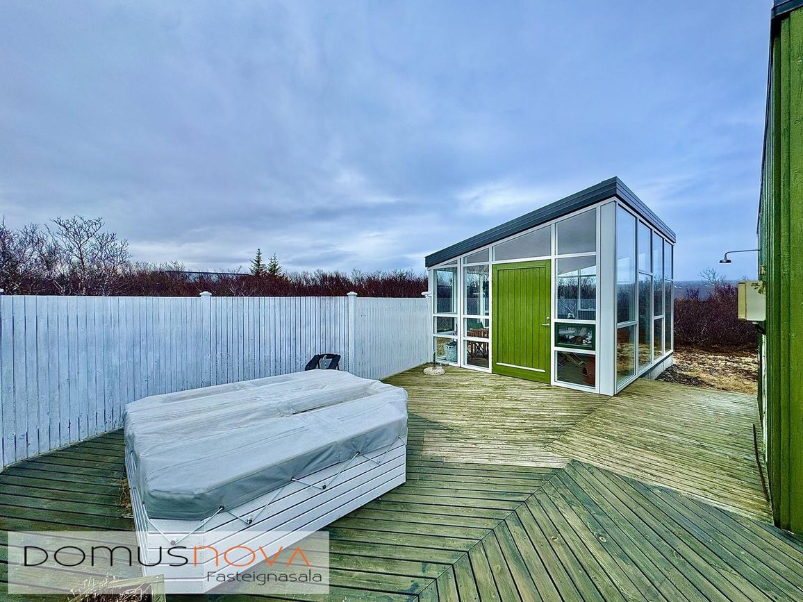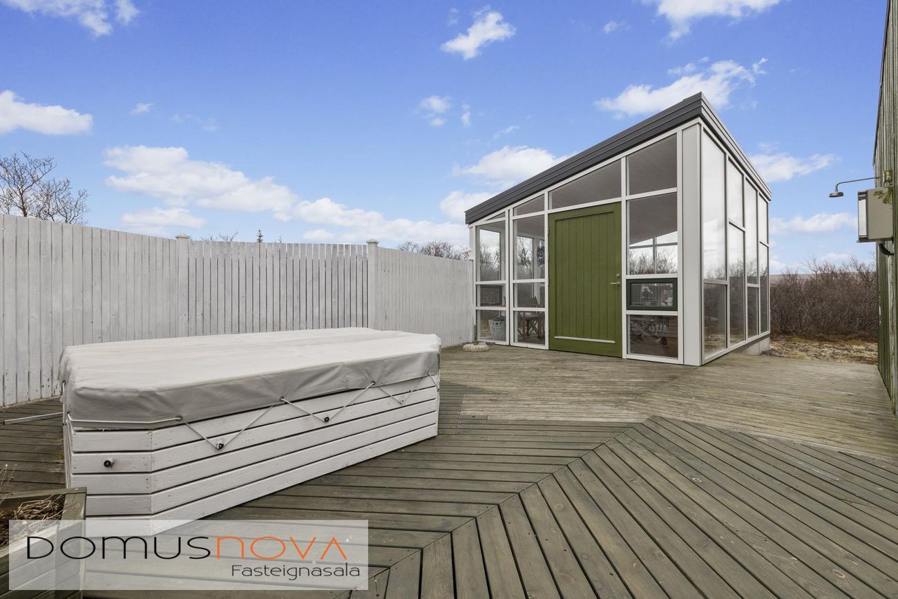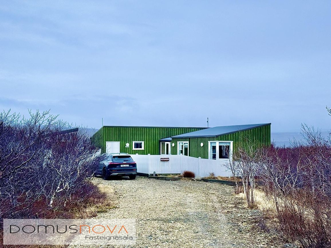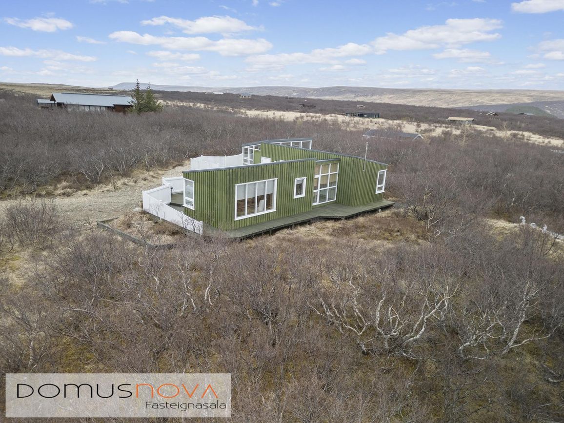 Aðalhús 76,8 fm og gestahús 22 fm á 6.500 fm leigulóð. Opinn grunnhönnuður rými með parketgólfum og aukinni lofthæð.