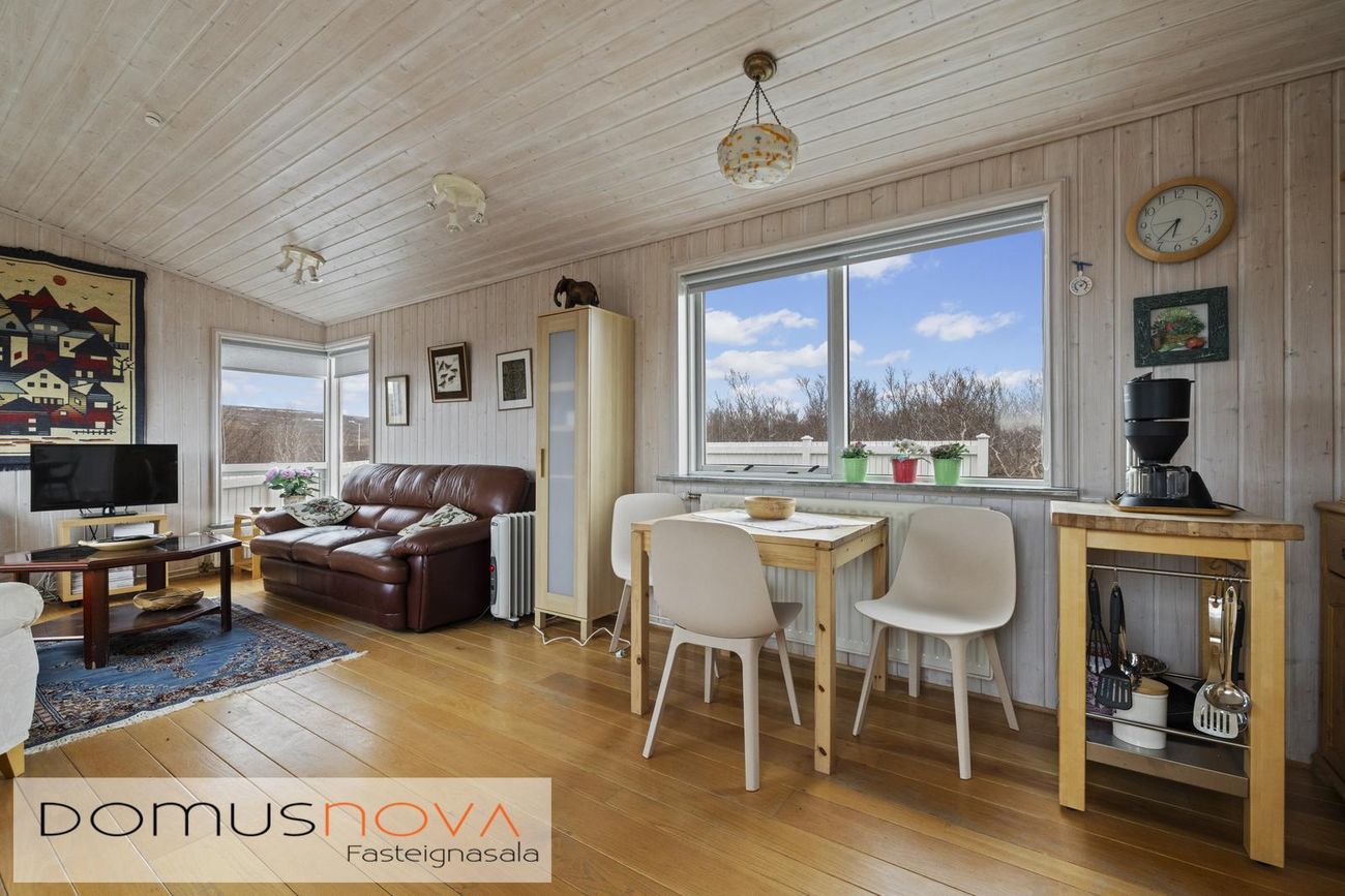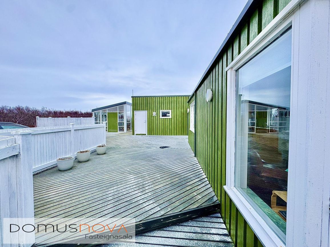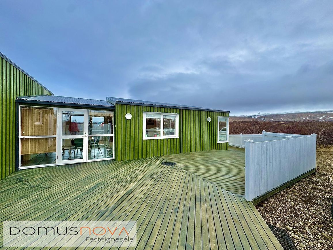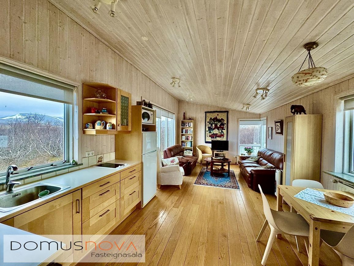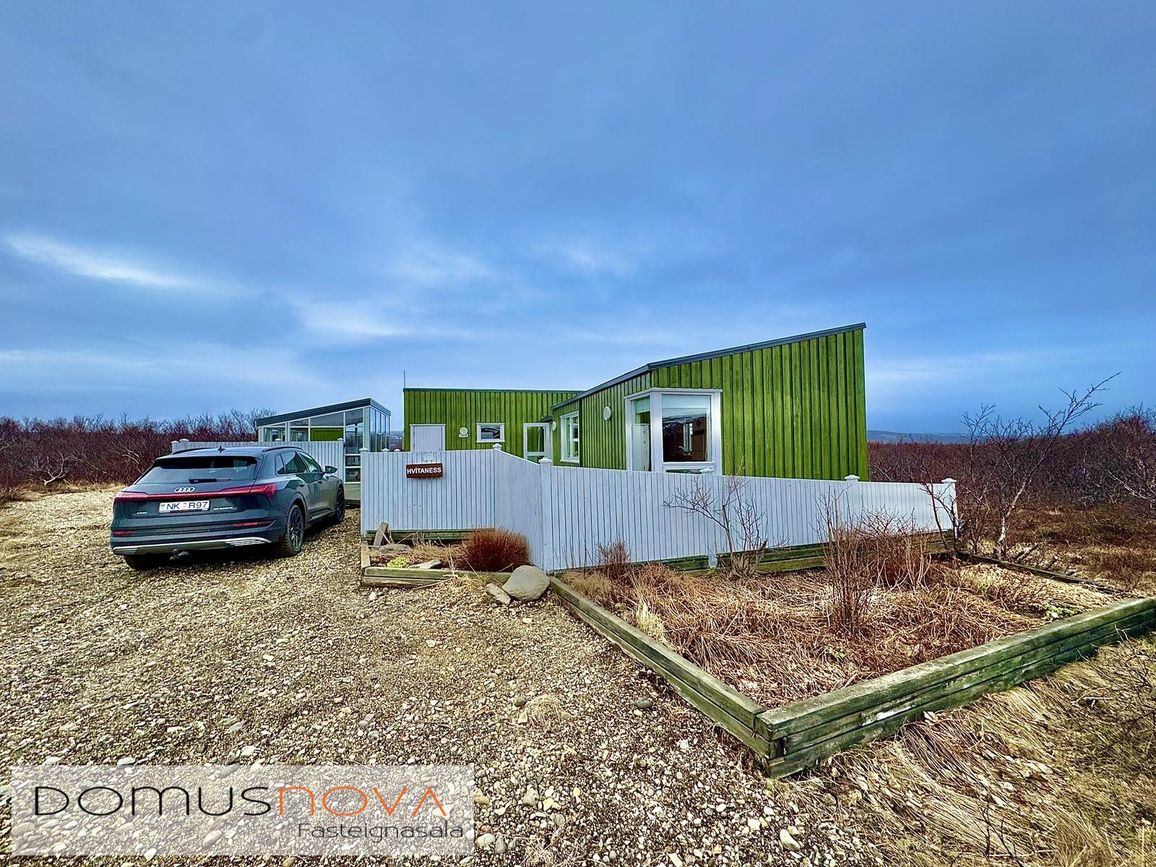 Aðalhús 76,8 fm og gestahús 22 fm á 6.500 fm leigulóð. Opinn grunnhönnuður rými með parketgólfum og aukinni lofthæð.